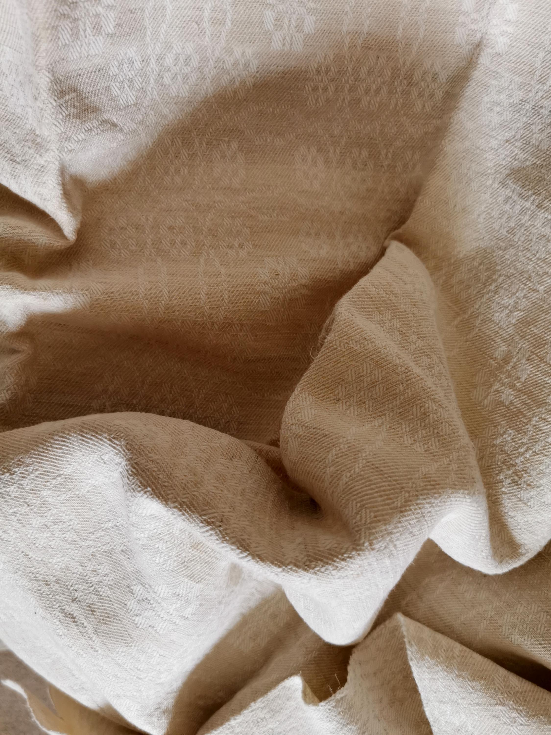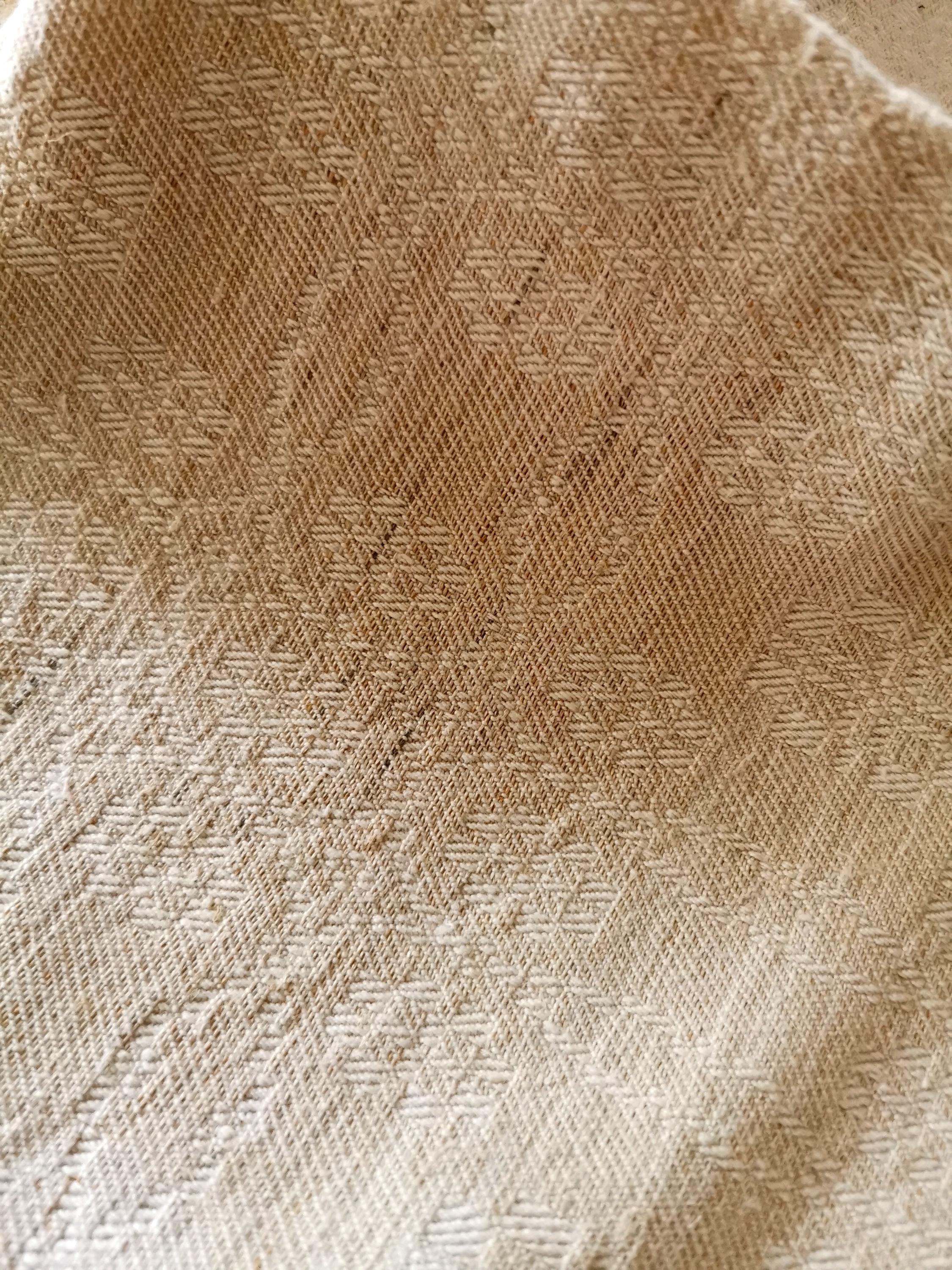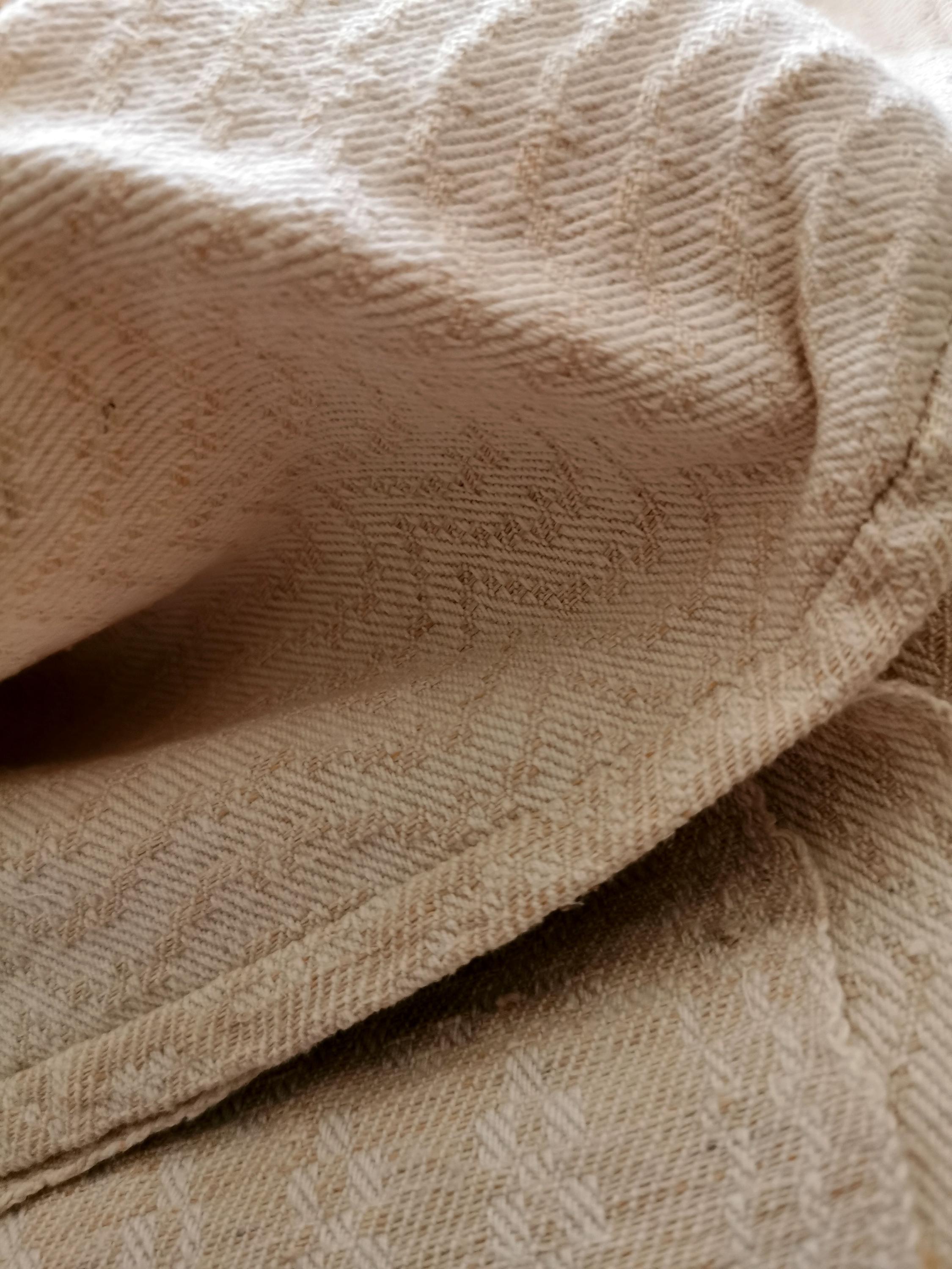 The piece is home spun, hand woven hemp very rustic, with uneven weaving and stray fibers (there's even a stray indigo blue thread that's been woven in) , as is usual with these lovely old cloths.