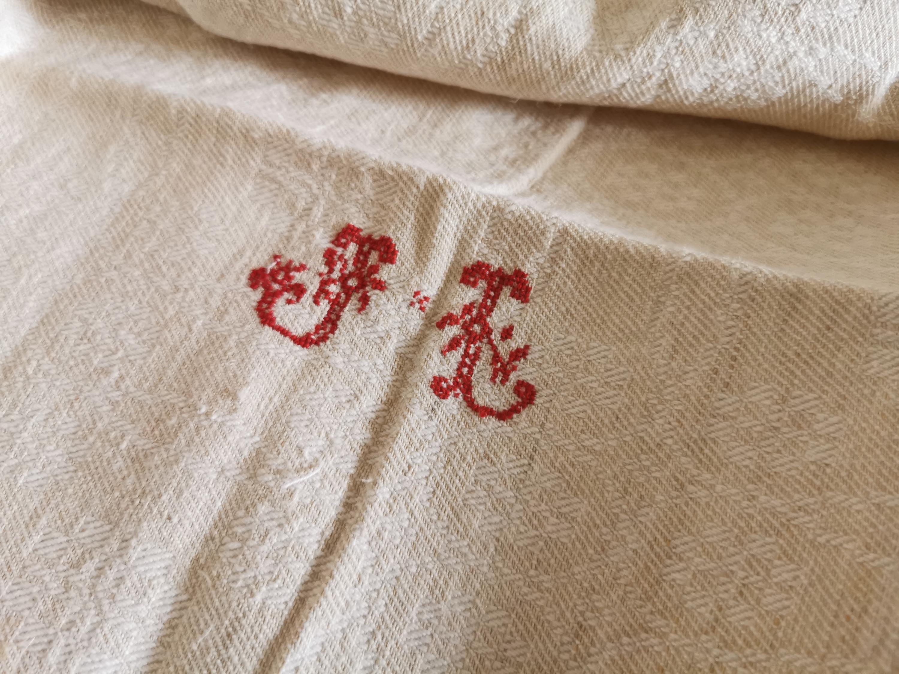 Straight from a Marriage Armoire, the piece appears to be unused. The rarity lies in the red initials embroidered onto an amazing homespun handwoven jacquard linen/chanvre mix, giving an exquisite rustic charm.