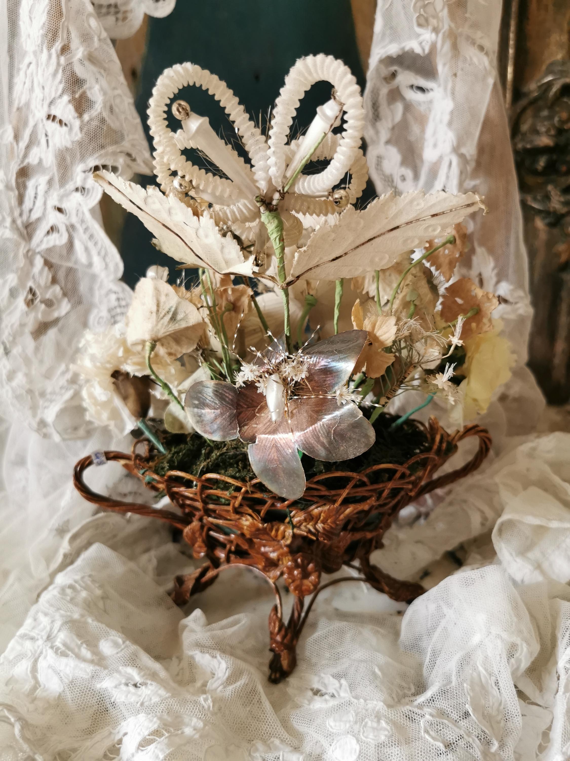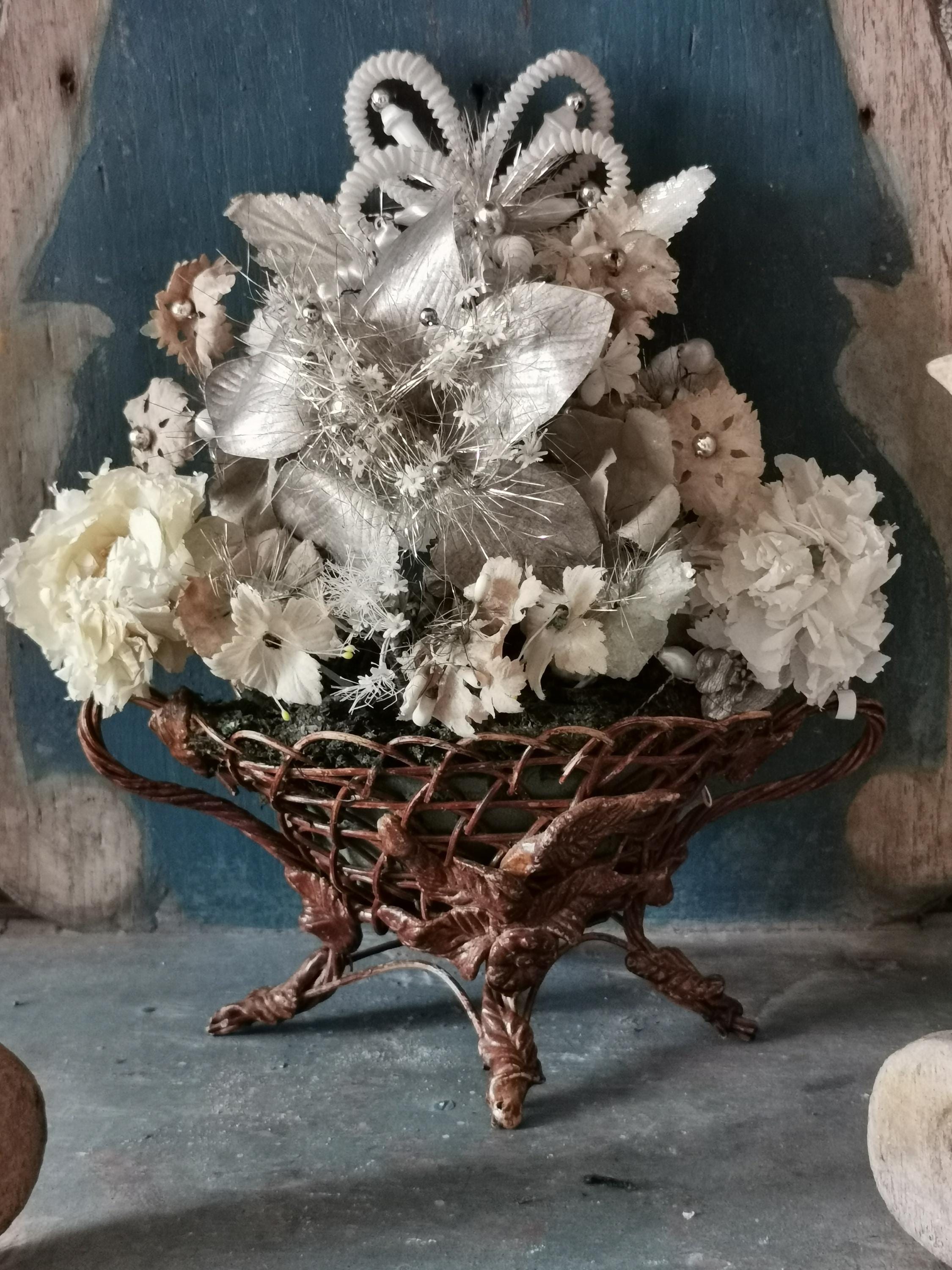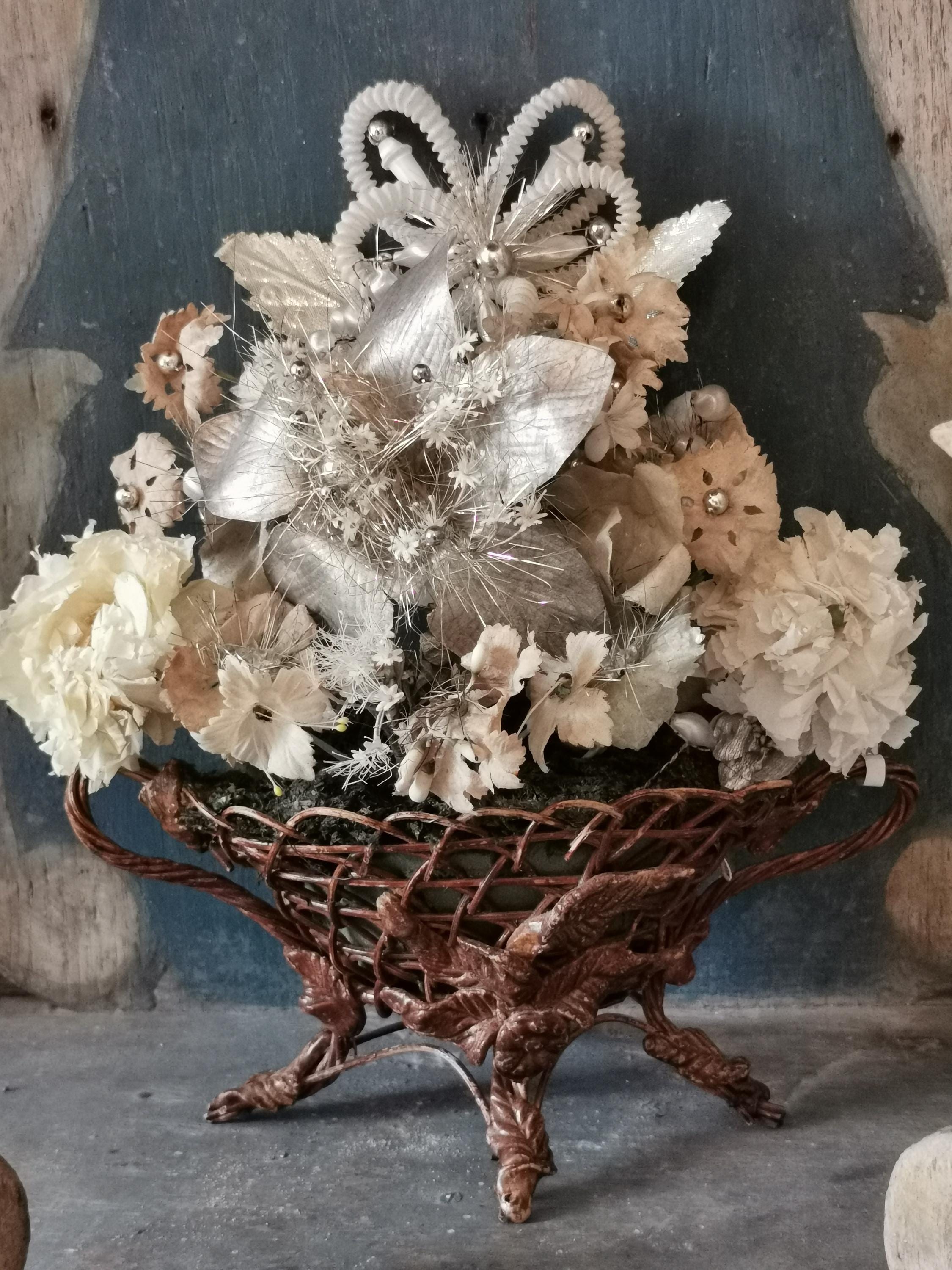 Consisting of a bouquet of shimmering flowers , buds , and leaves. Very rare, as they are made from paper, silk , and silver foil, displayed in a tiny handwoven basket, please note the much more recent base the flowers are placed in has been used to display beautifully.