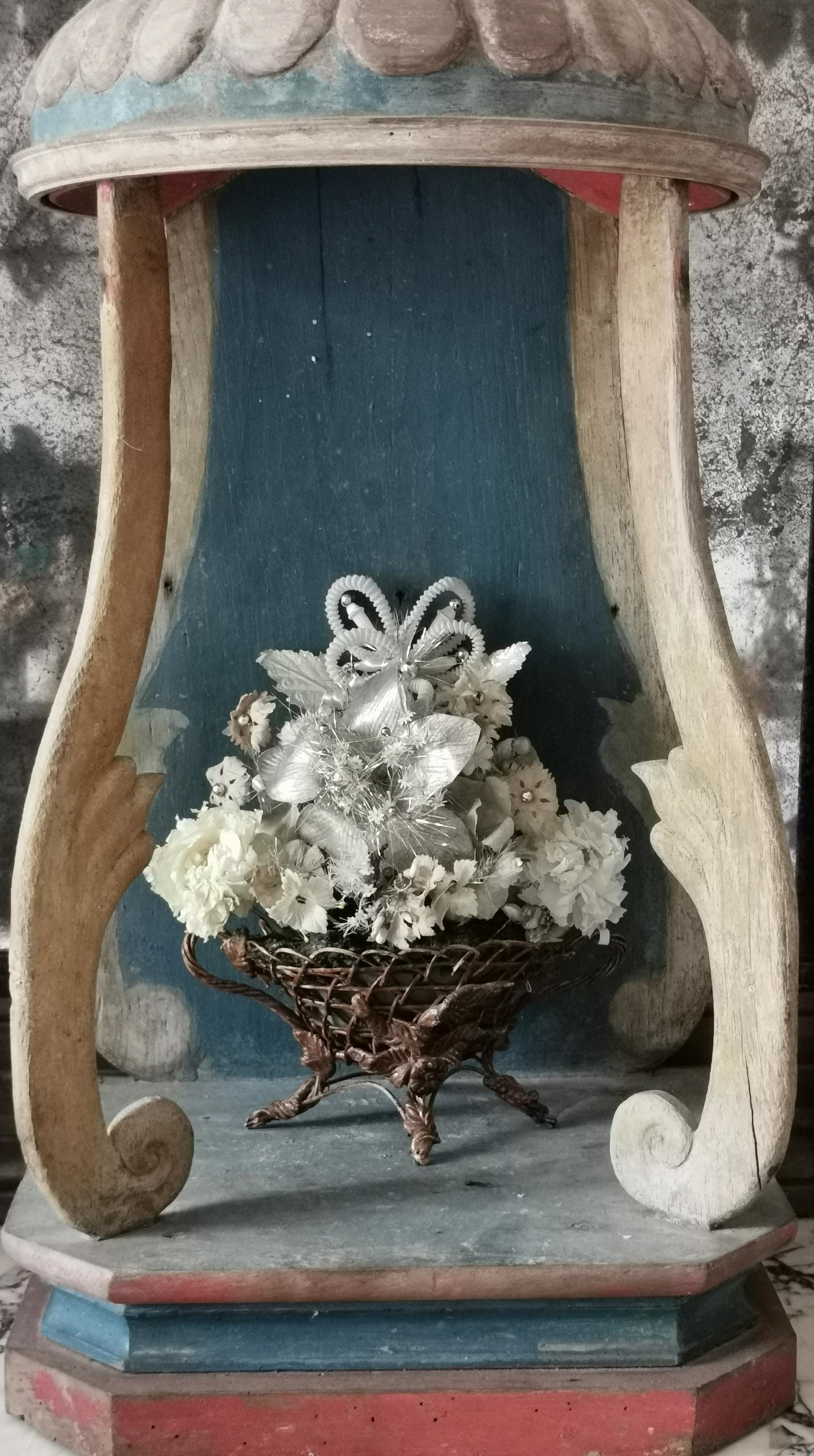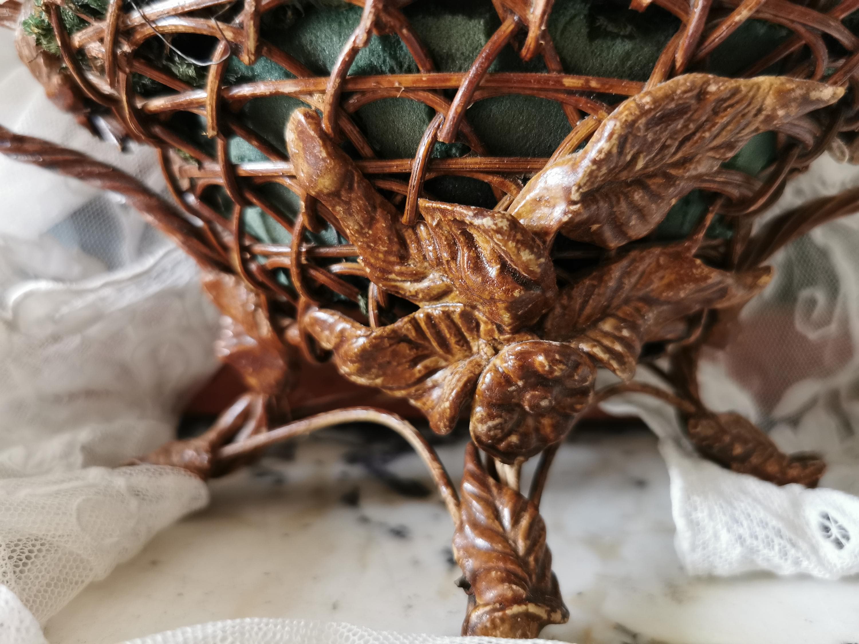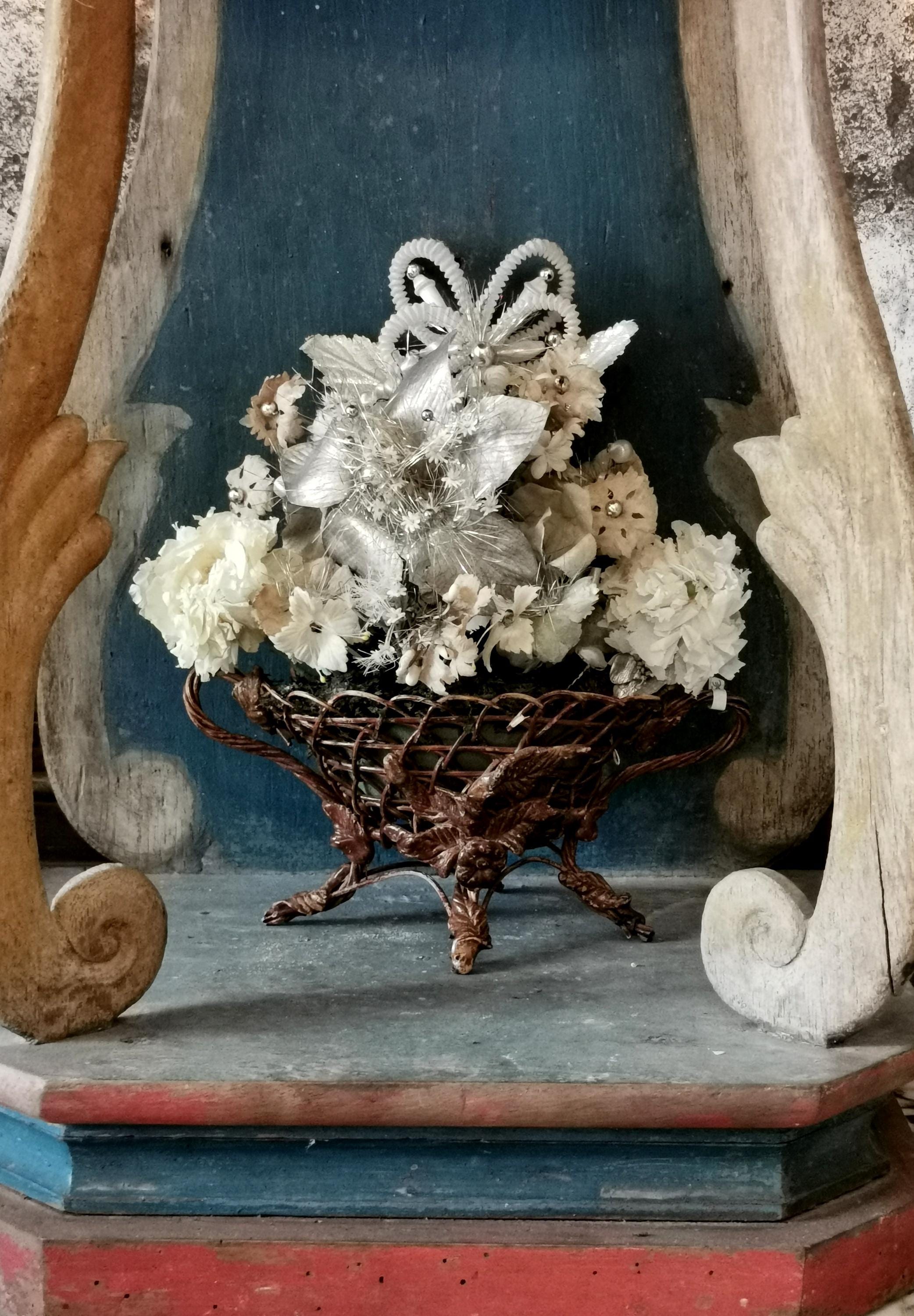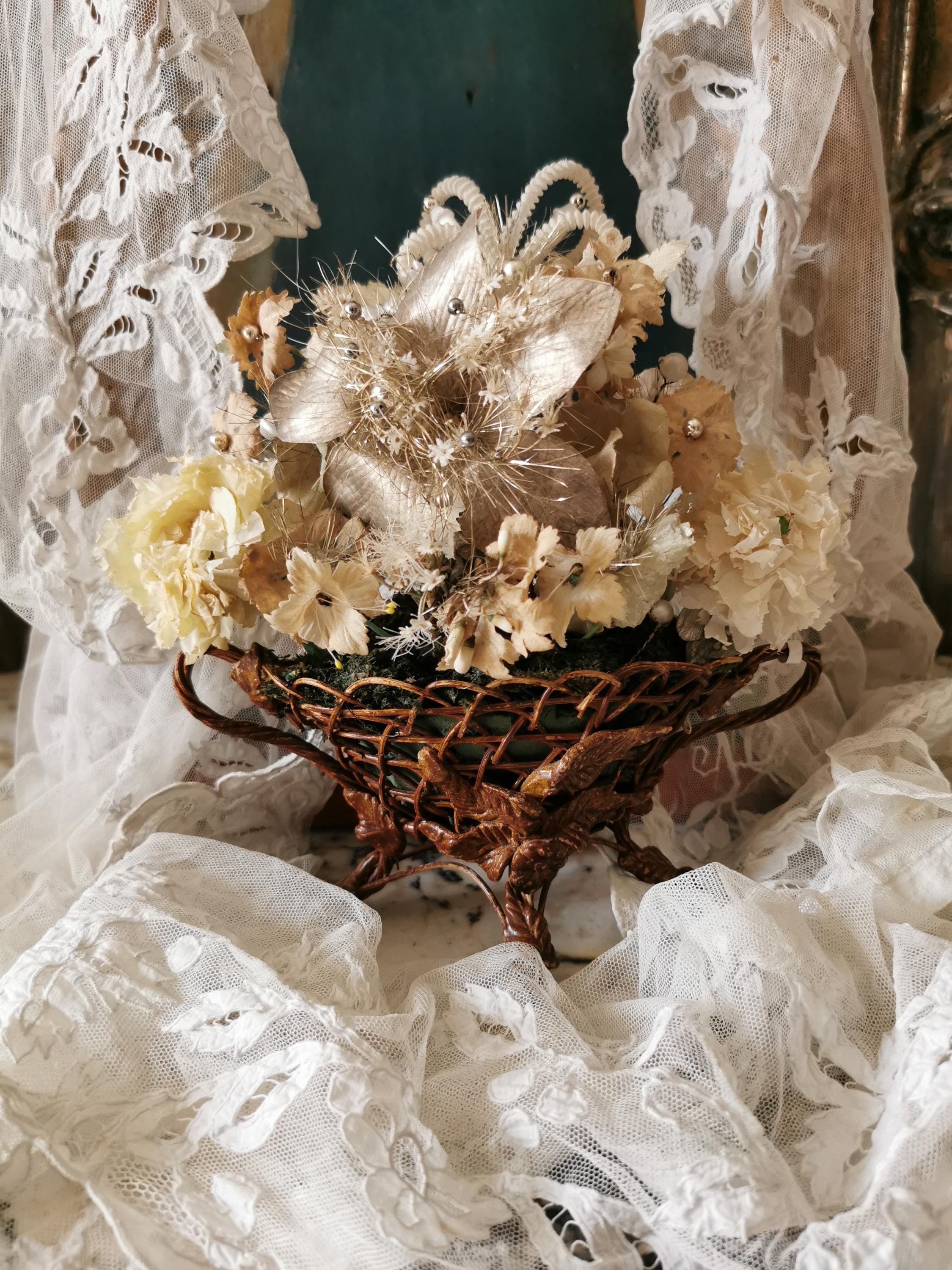 Consisting of a bouquet of shimmering flowers , buds , and leaves. Very rare, as they are made from paper, silk , and silver foil, displayed in a tiny handwoven basket, please note the much more recent base the flowers are placed in has been used to display beautifully.