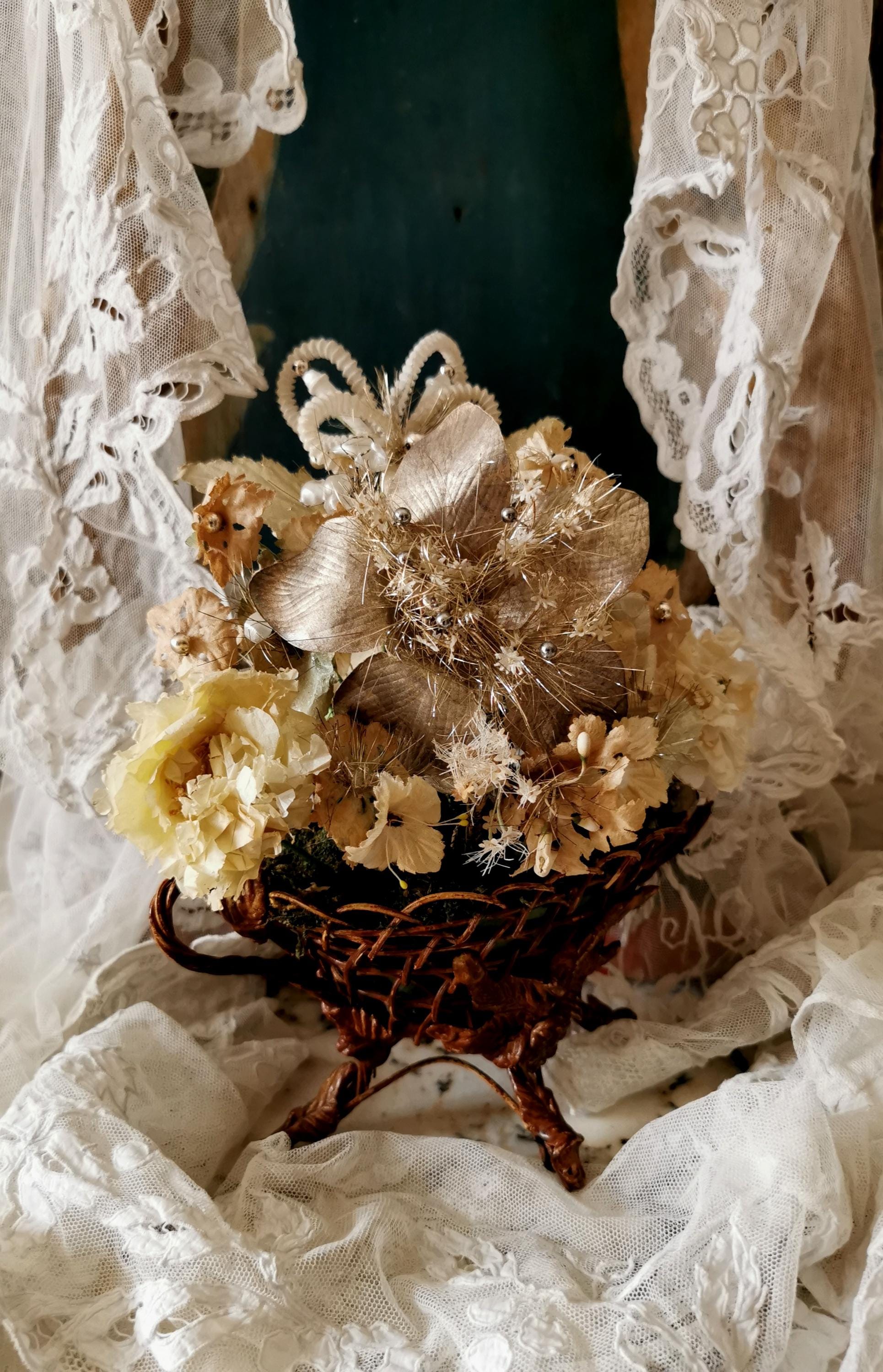 The photographs show how I display my antique wedding flowers, I absolutely adore them, and use them decoratively all around my house. The pice is for the basket of flowers all other objects are my own.