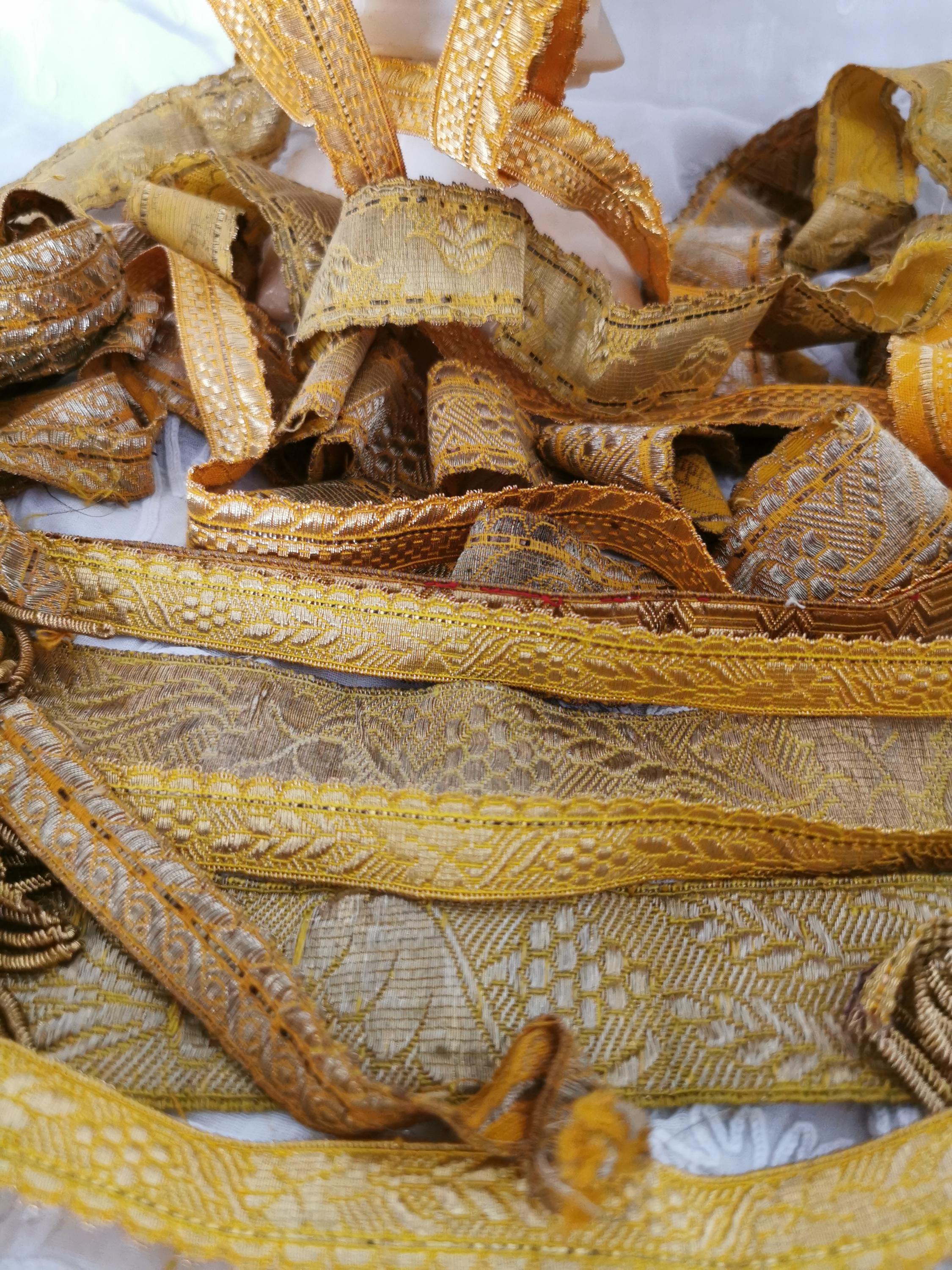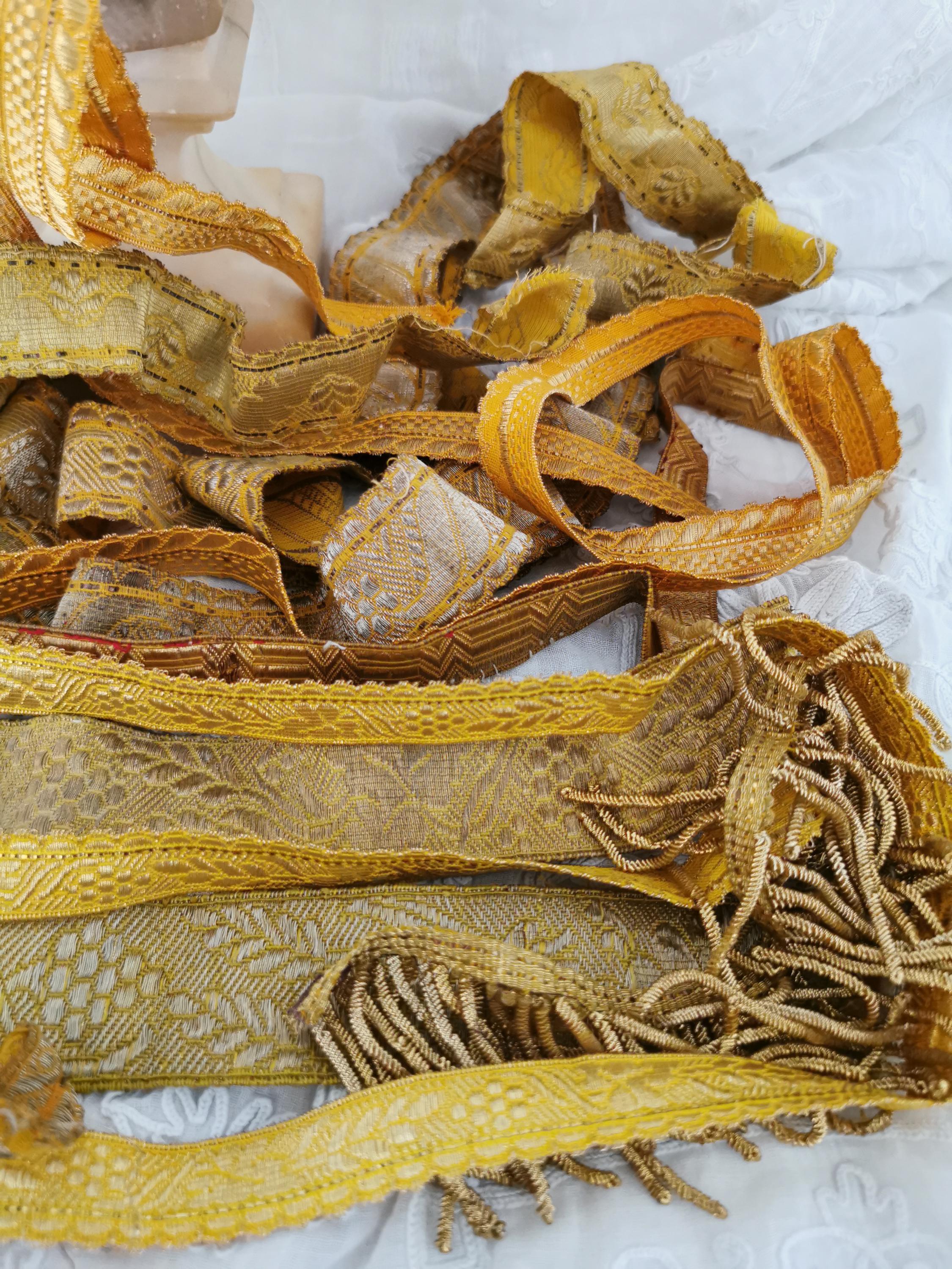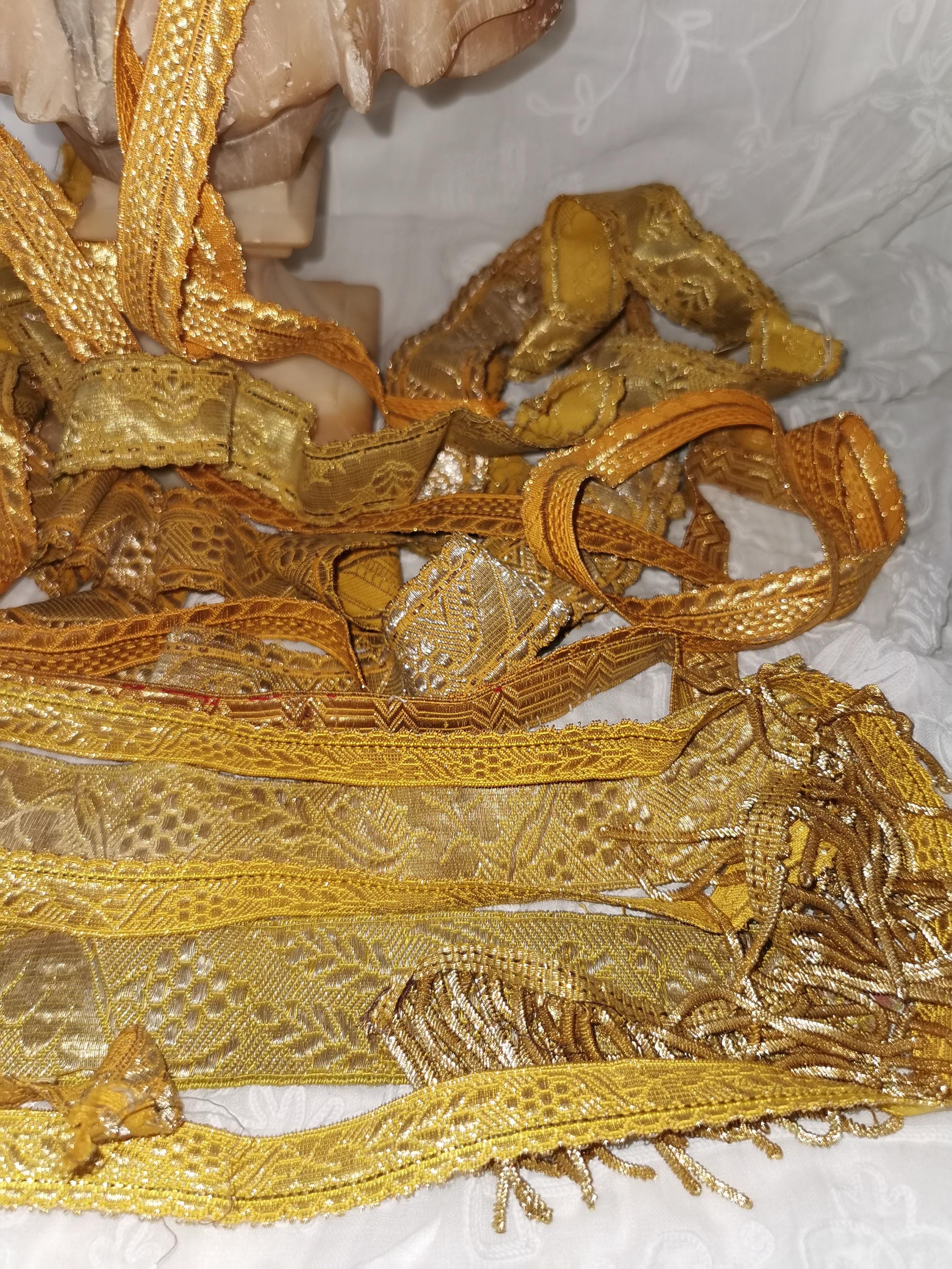 A gorgeous collection ( 10+mtrs) of 18th and 19th gold trims and fringing. Some lengths are unused and rare. A really useful batch for the crafter, restorer, card maker, Santos doll restorer, pillow maker.