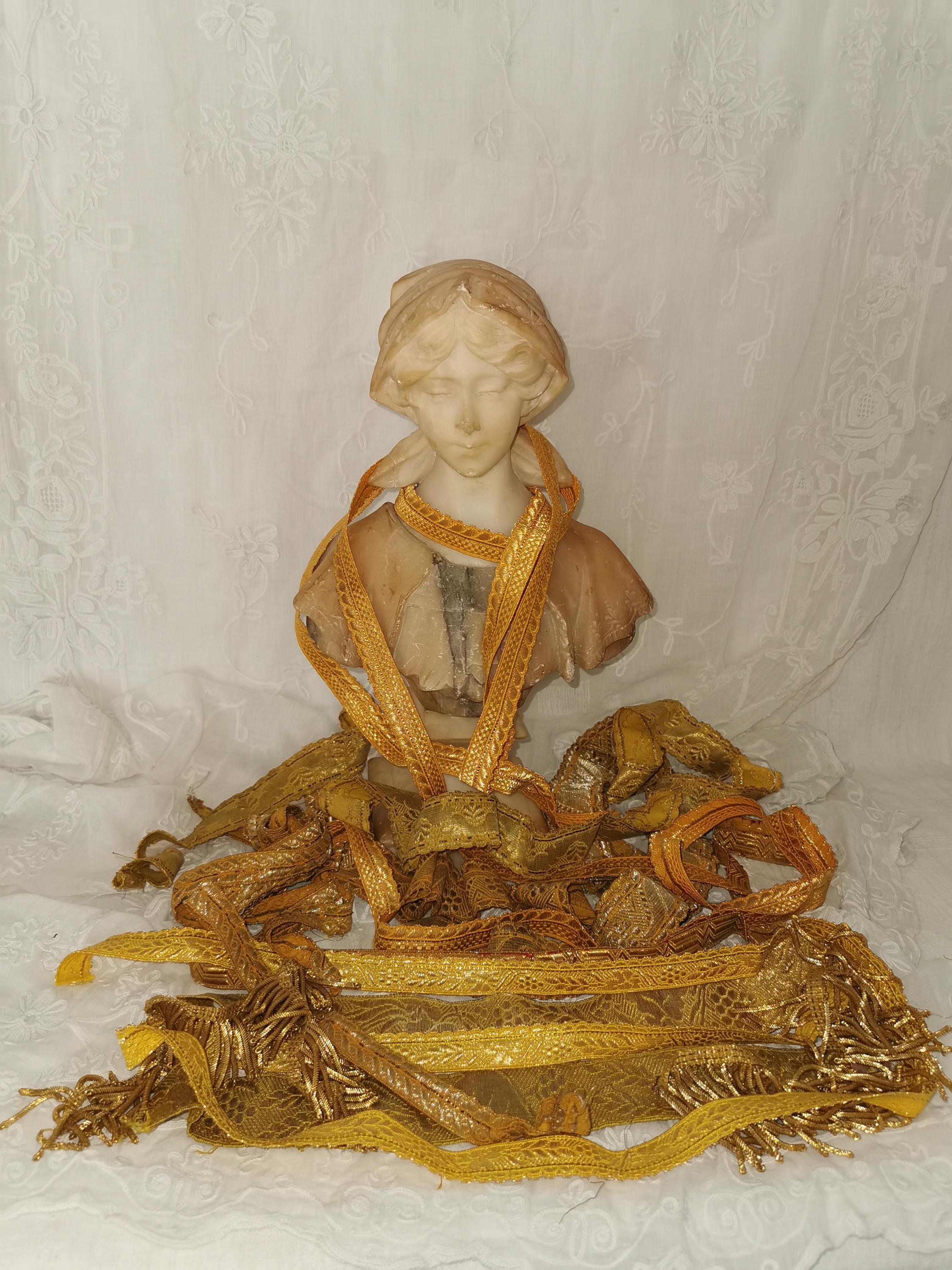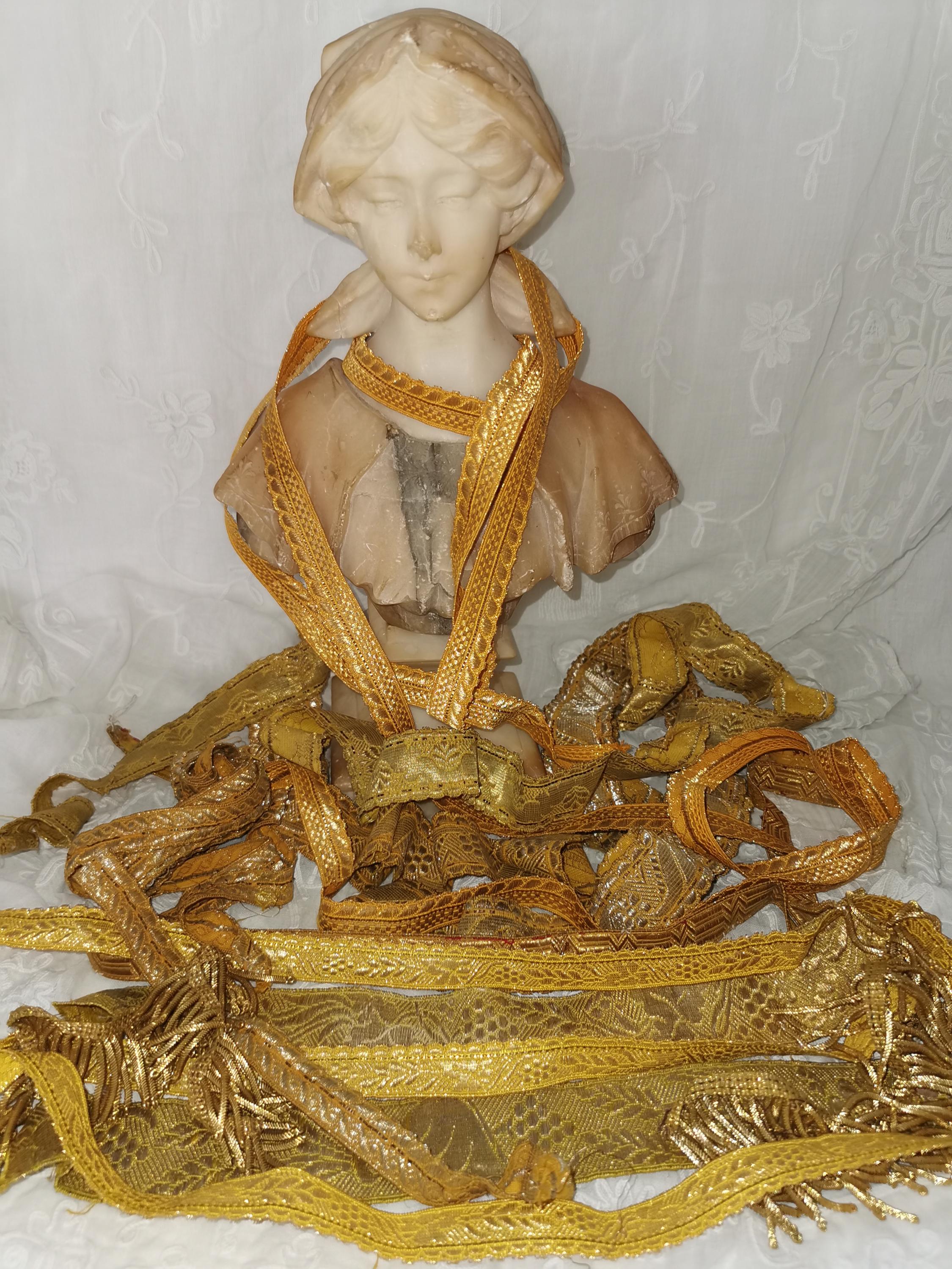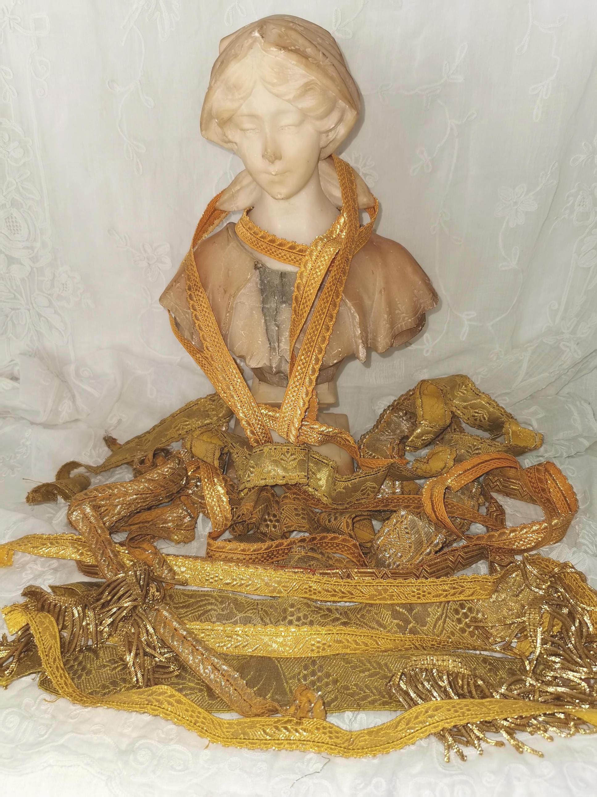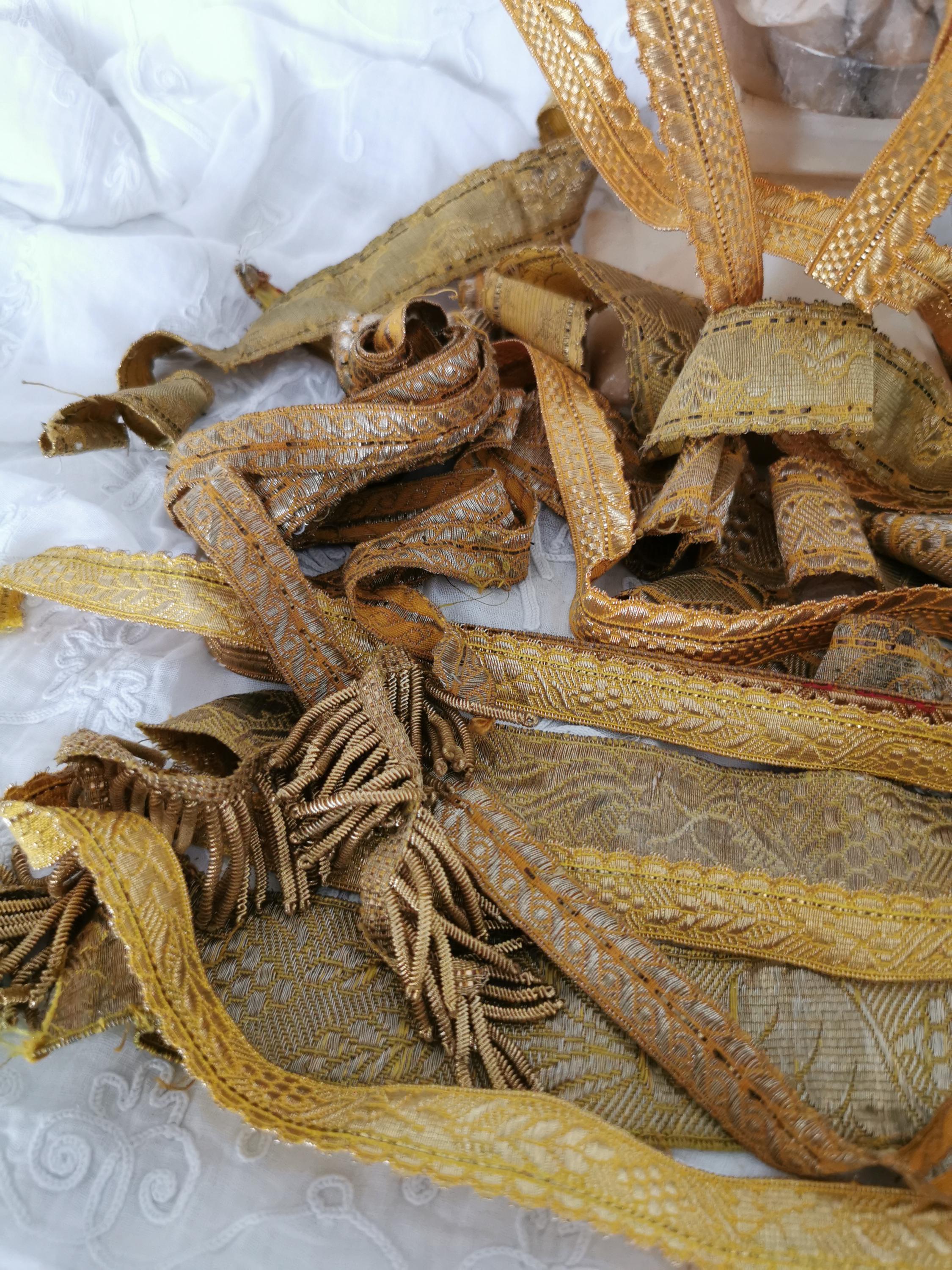 A gorgeous collection ( 10+mtrs) of 18th and 19th gold trims and fringing. Some lengths are unused and rare. A really useful batch for the crafter, restorer, card maker, Santos doll restorer, pillow maker.