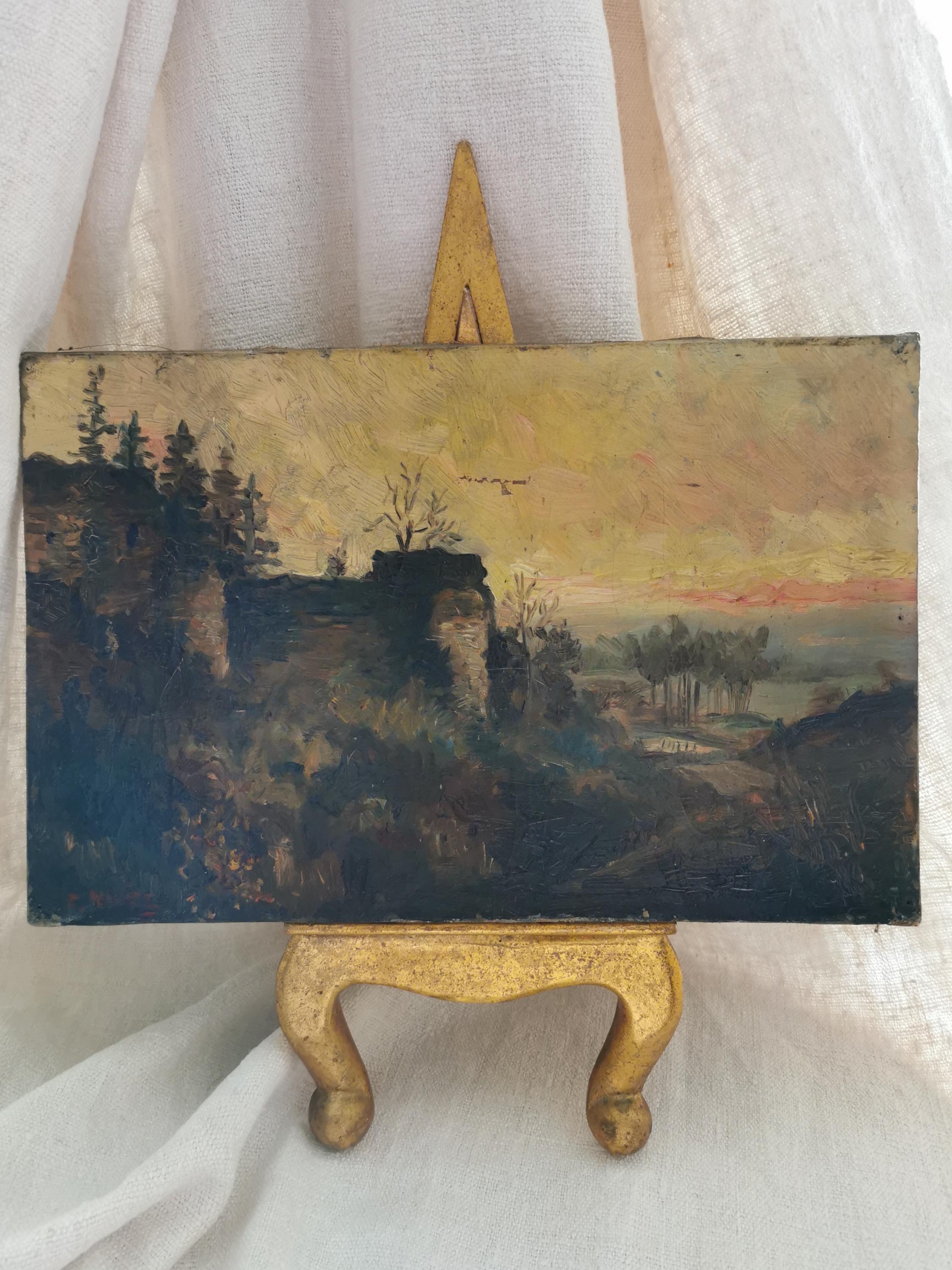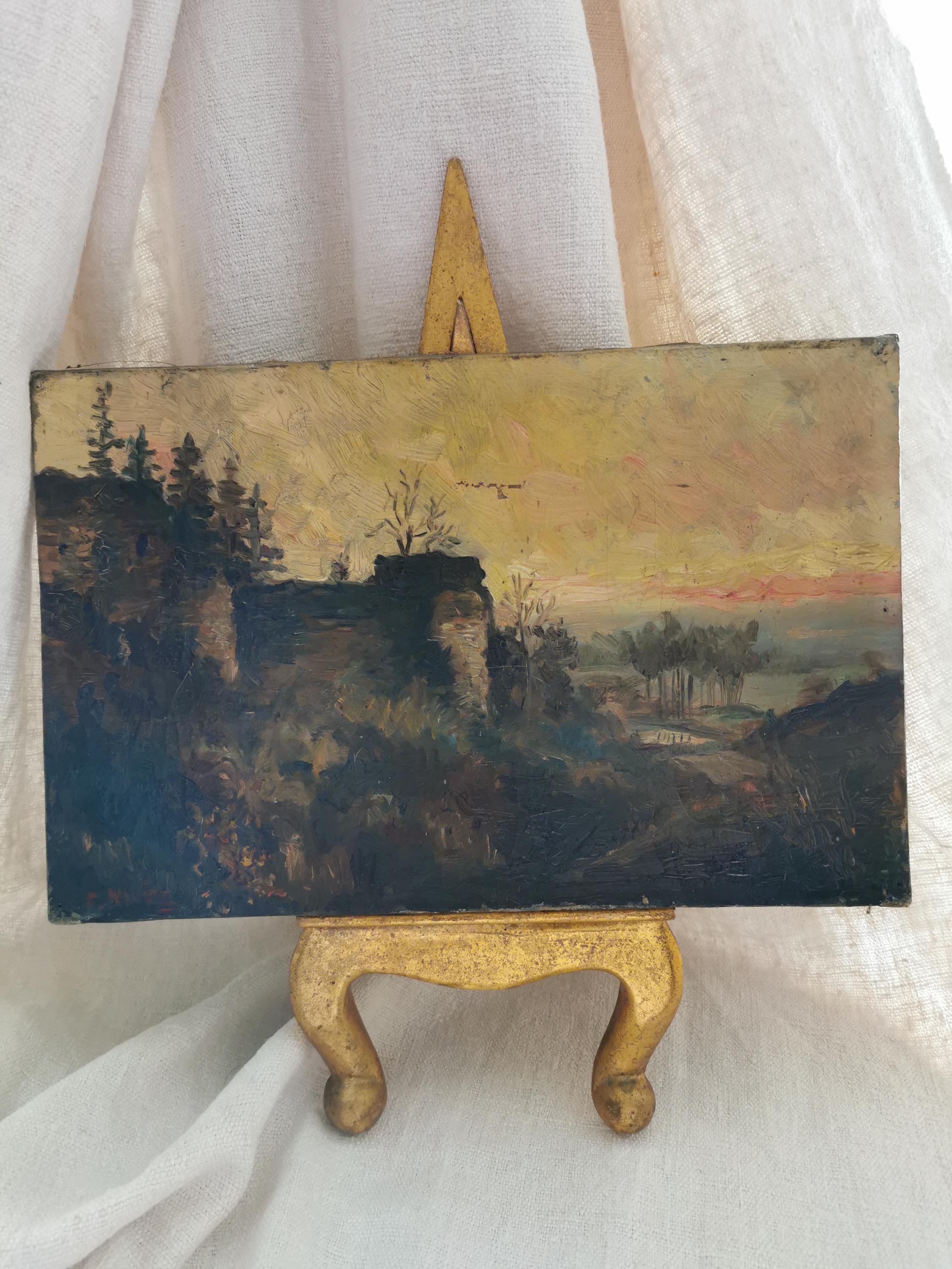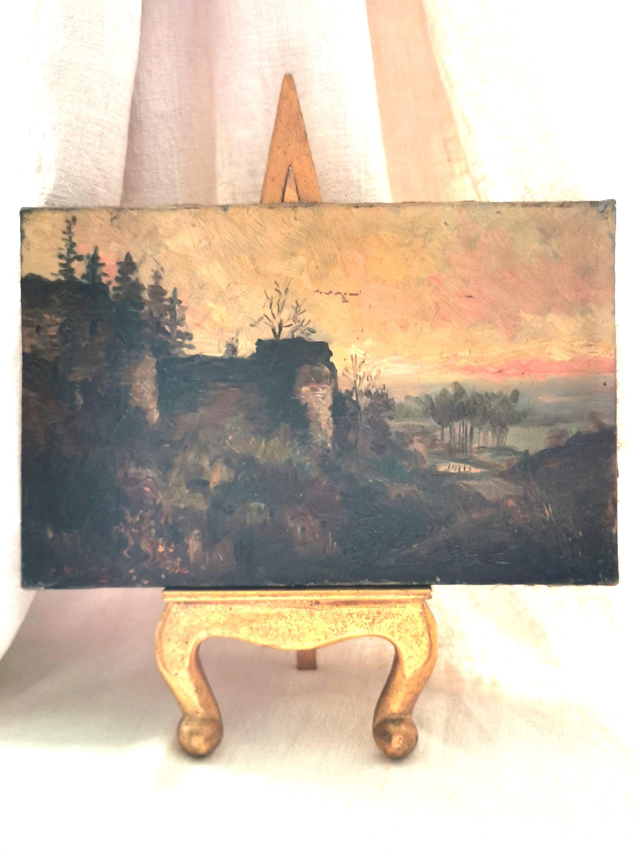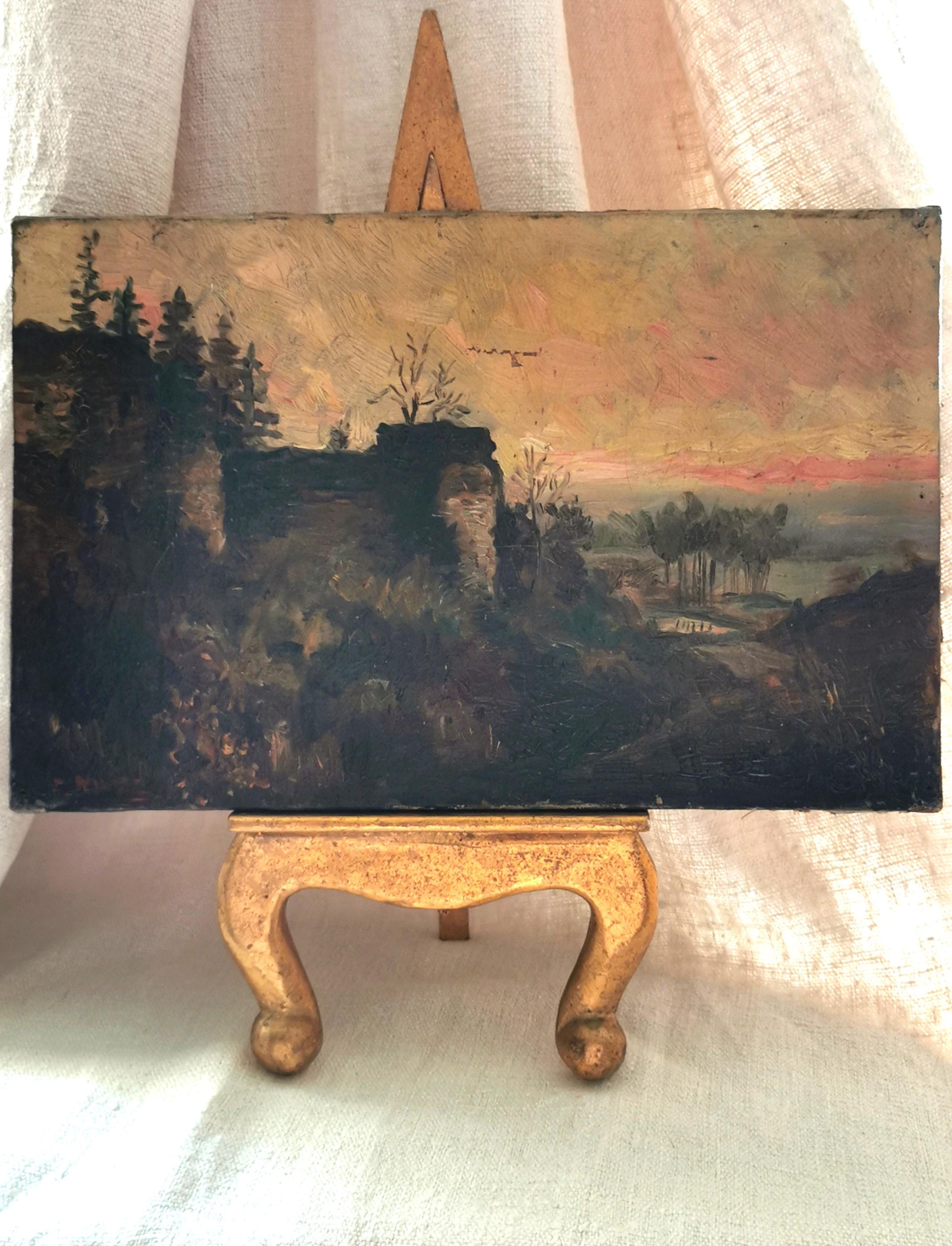 A charming antique French oil painting capturing romantic ruins perched on a rocky hillside above tranquil water at sunset. Painted in warm earthy tones with expressive brushwork, this atmospheric landscape reflects the plein air tradition inspired by the Barbizon School and early Impressionism.