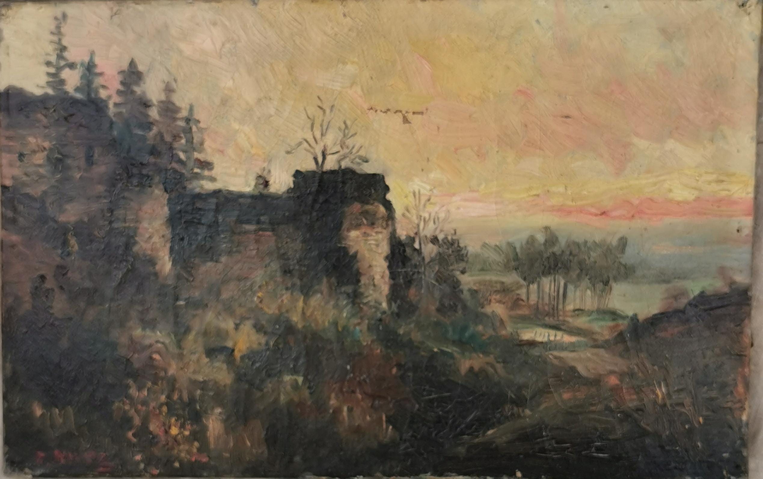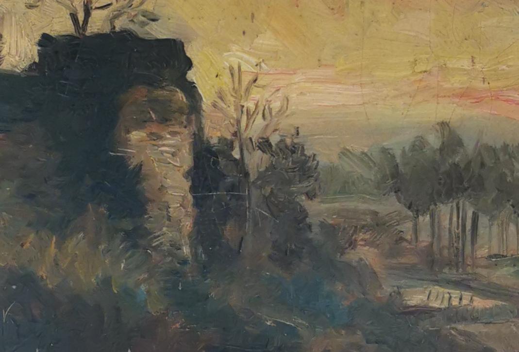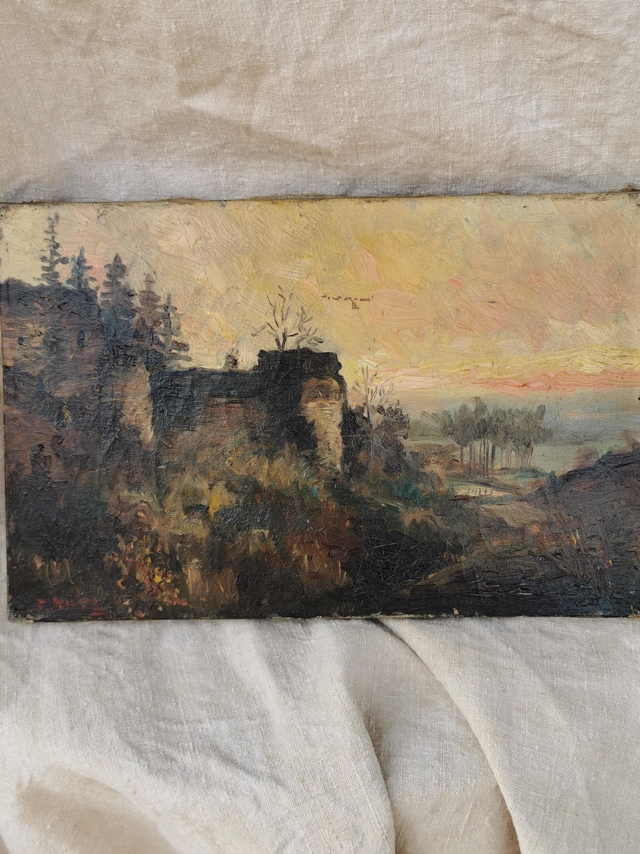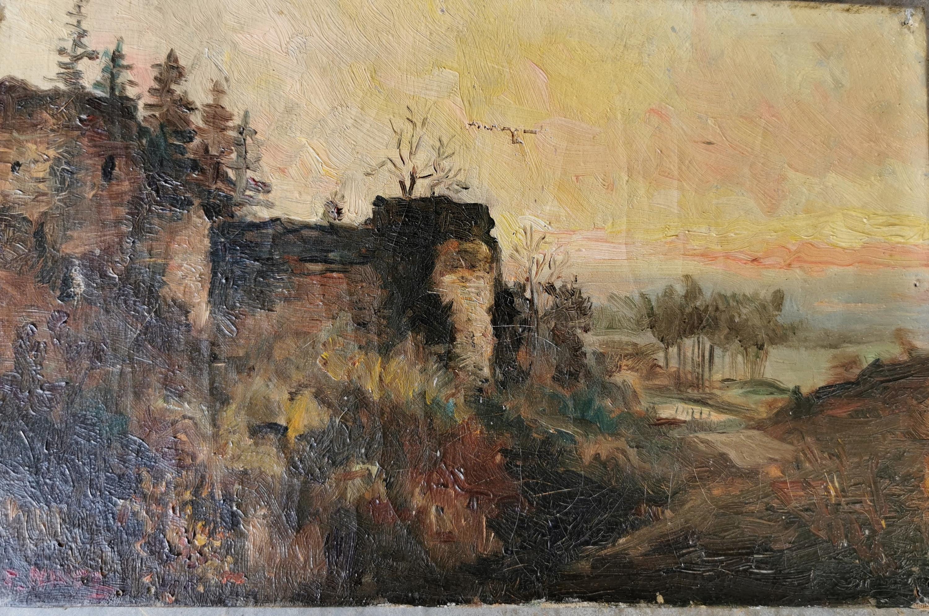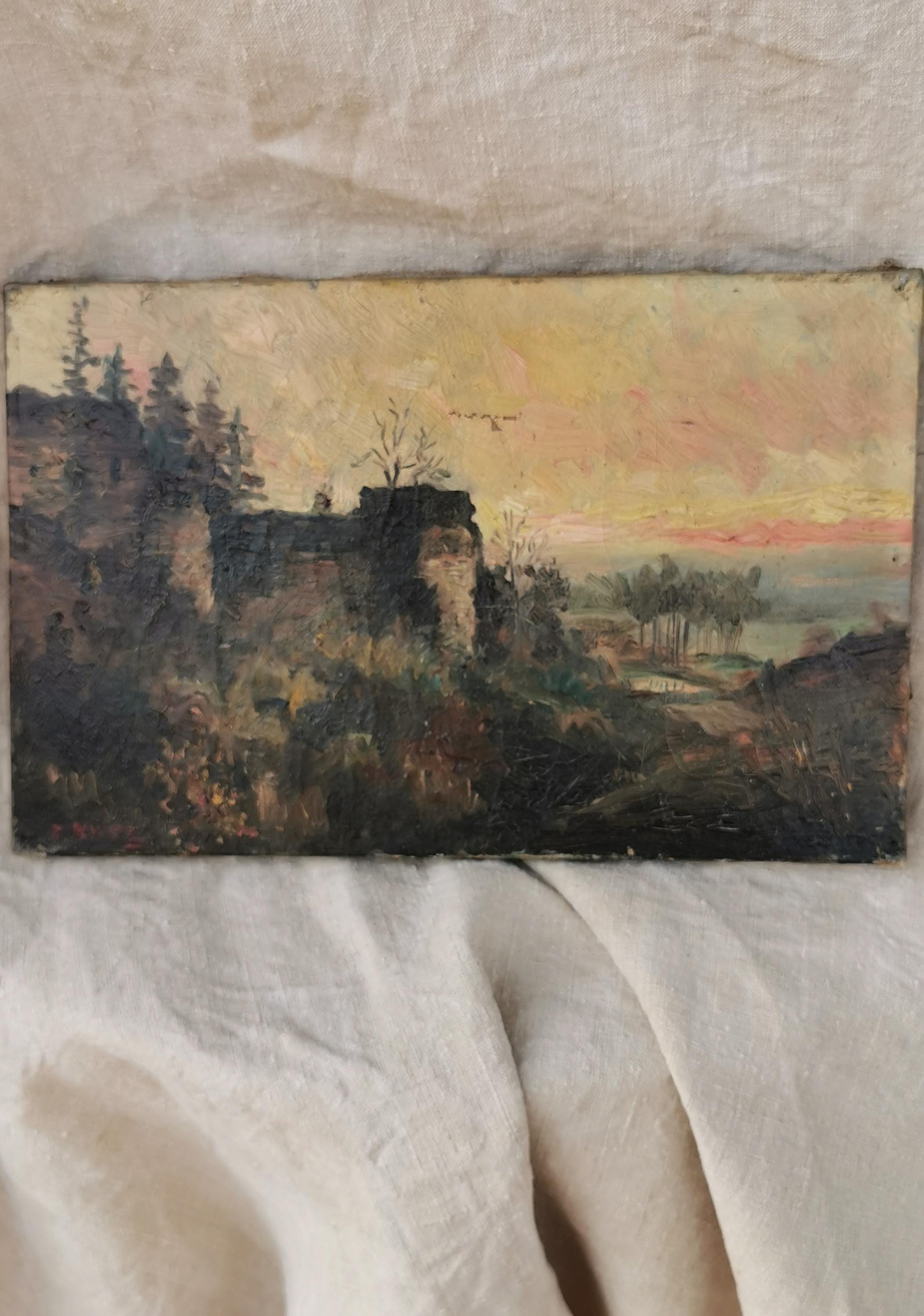 A charming antique French oil painting capturing romantic ruins perched on a rocky hillside above tranquil water at sunset. Painted in warm earthy tones with expressive brushwork, this atmospheric landscape reflects the plein air tradition inspired by the Barbizon School and early Impressionism.