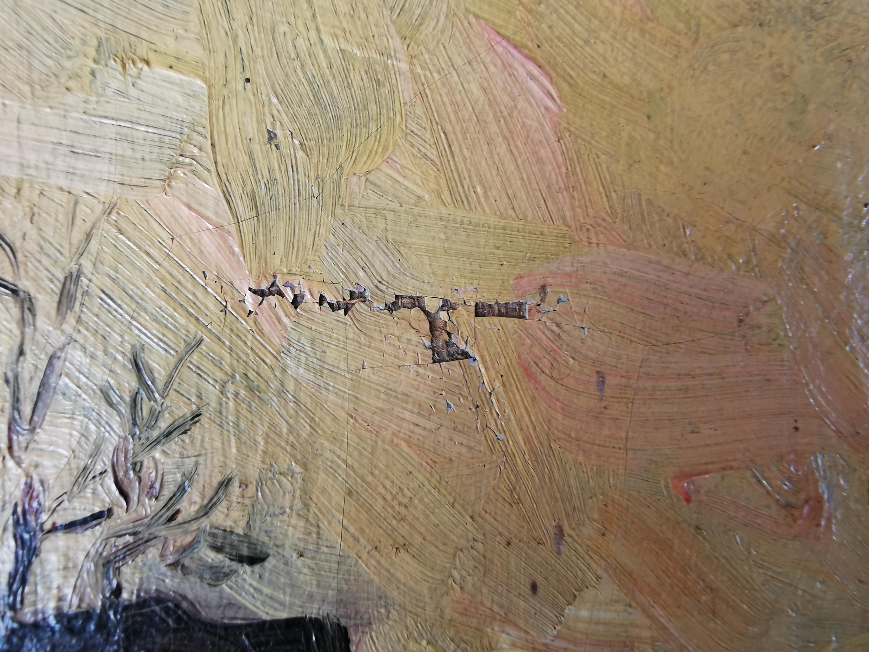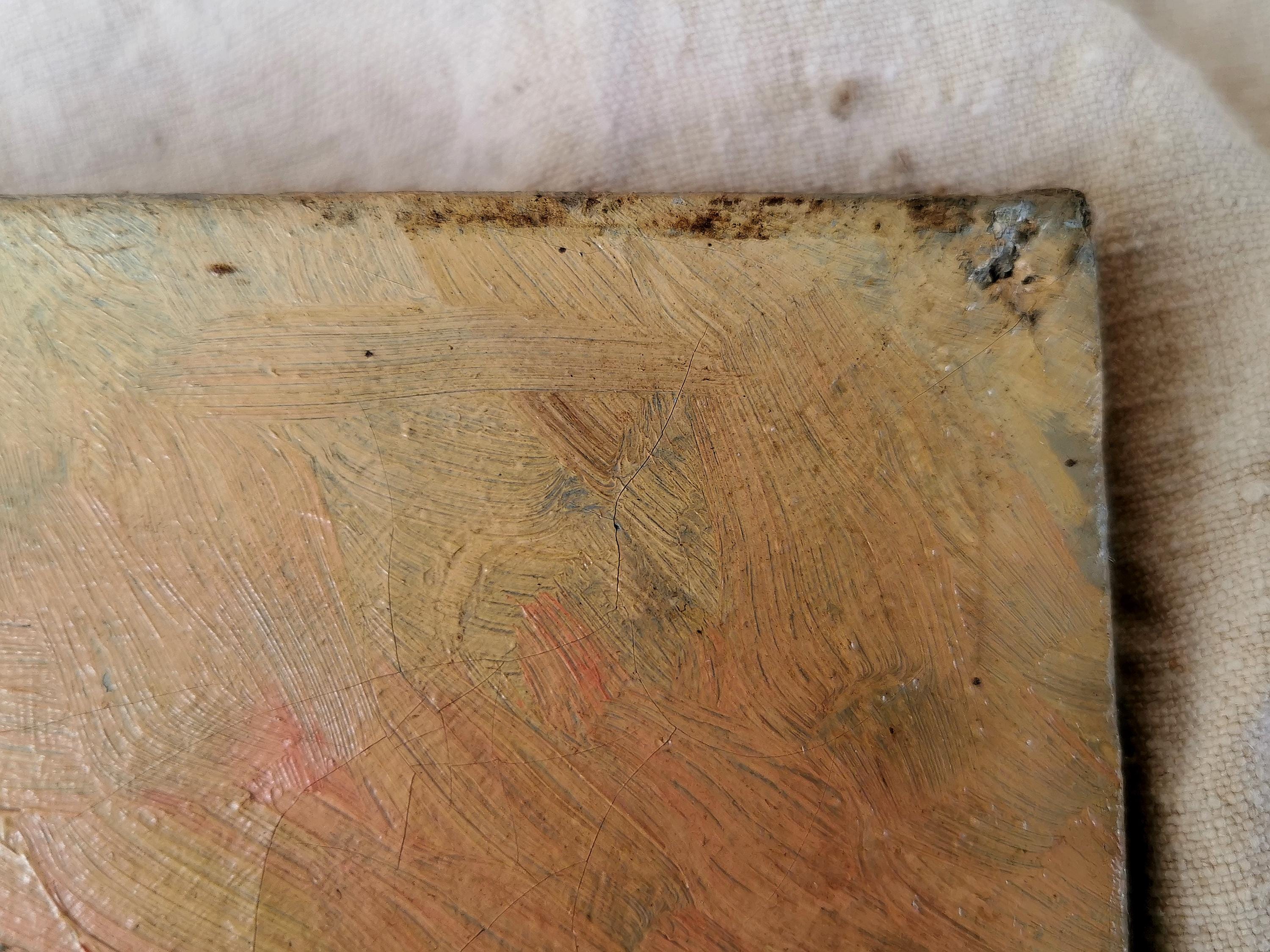 Good but used antique condition with age-appropriate craquelure, surface wear, and patina consistent with its age. Please note some small losses of paint, and a small split that's been stabillised with a patch to the back, the work would benefit from some restoration, and cleaning, I personally love the aged appearance. The work is unframed.
