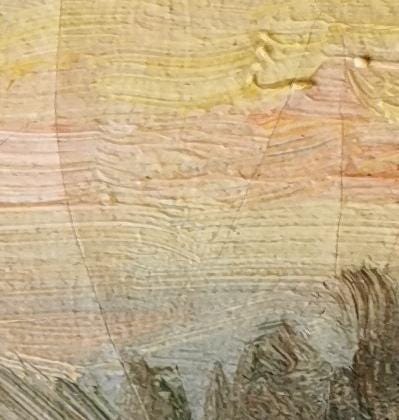 Four small pin holes in the corners suggest the piece was painted outdoors and pinned to a board while the artist worked on site.