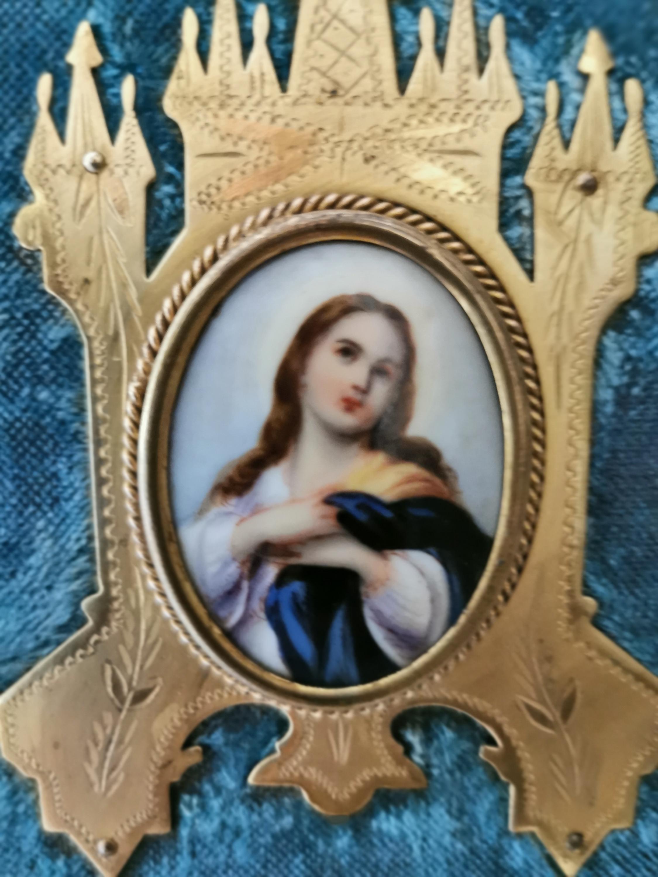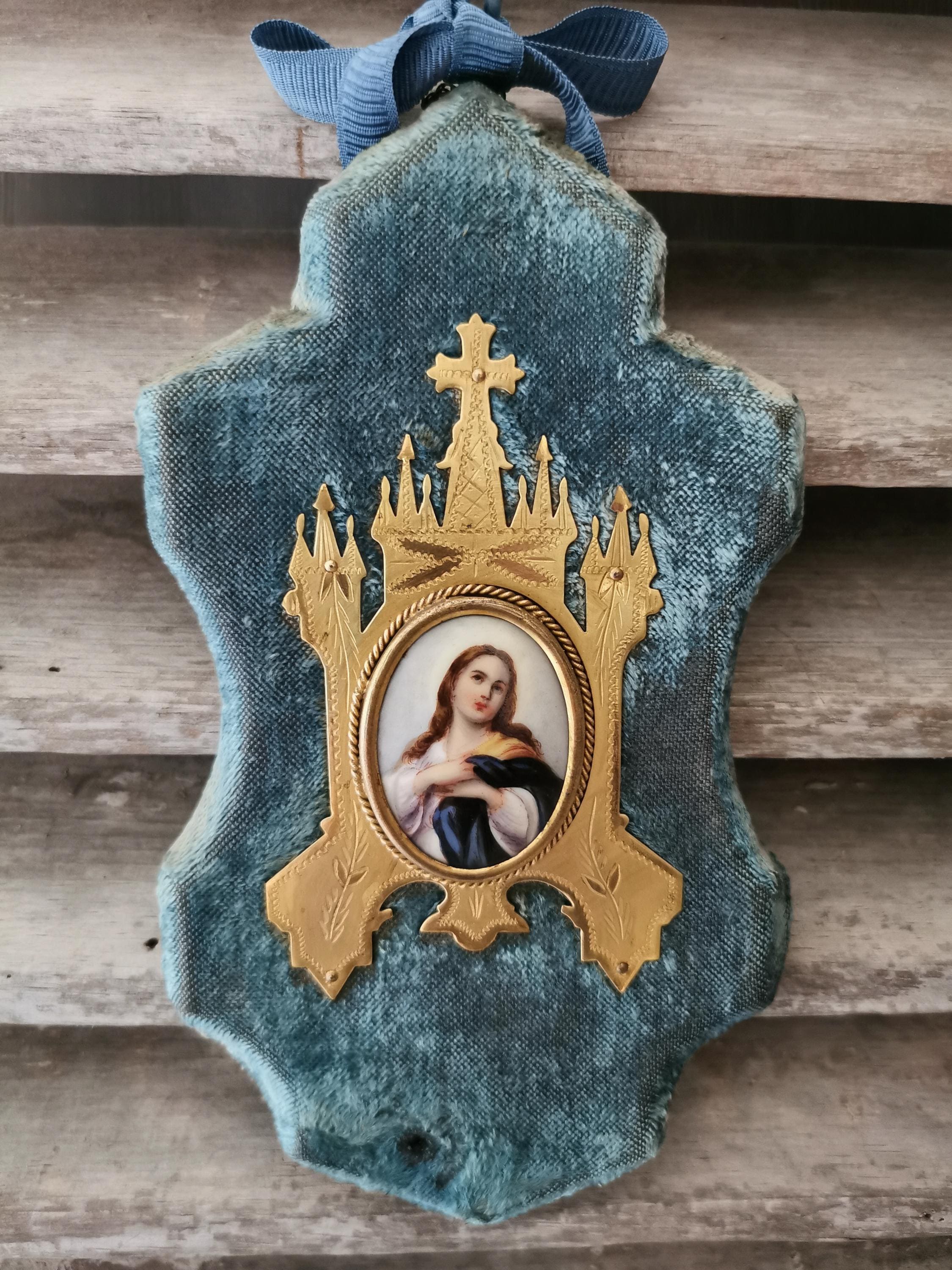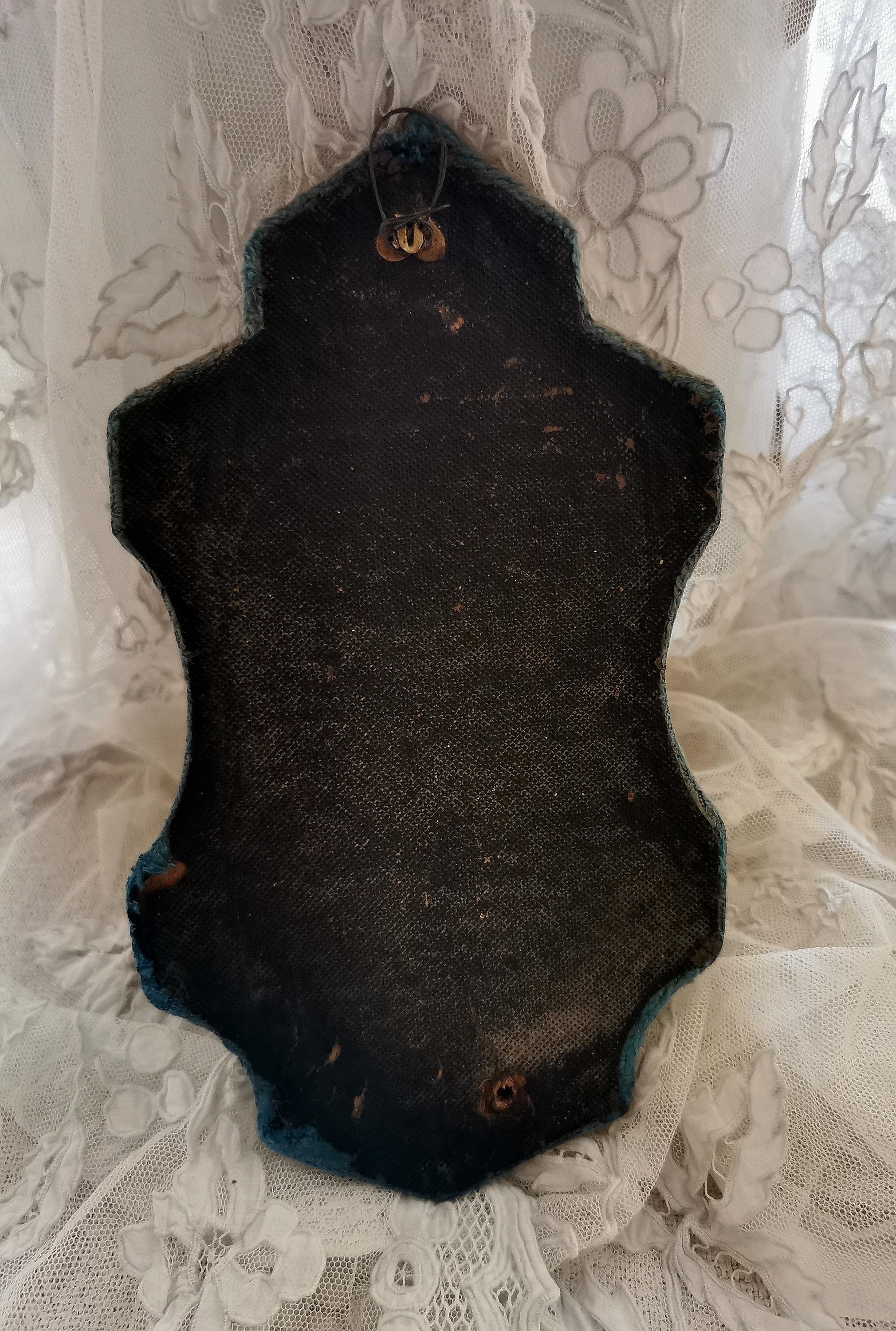 c 1890, Beloved object of devotion a very beautiful depiction of the Virgin Mary, set in a gilt frame mounted on a shaped, silk velvet covered backboard in a heavenly teal blue.