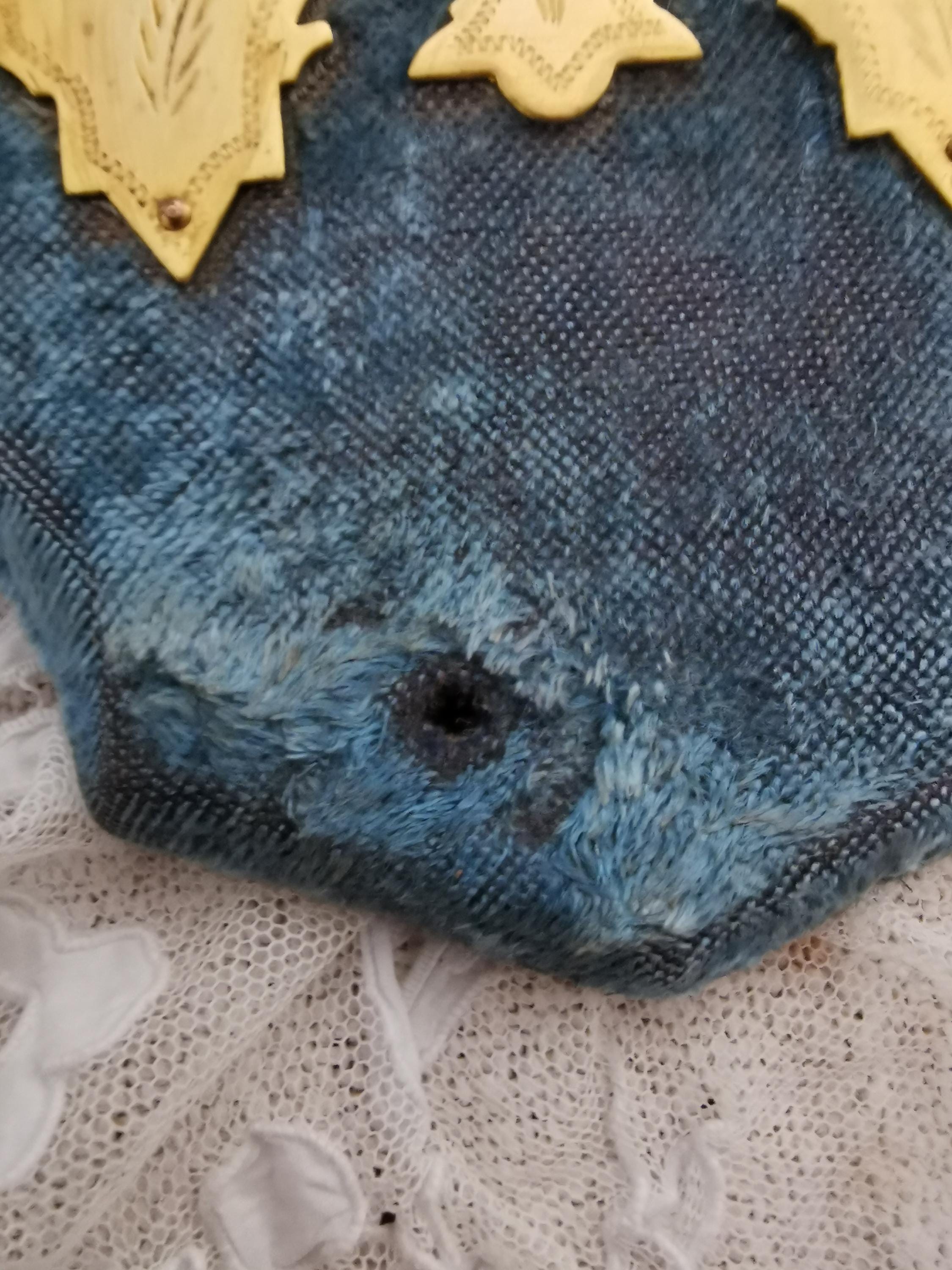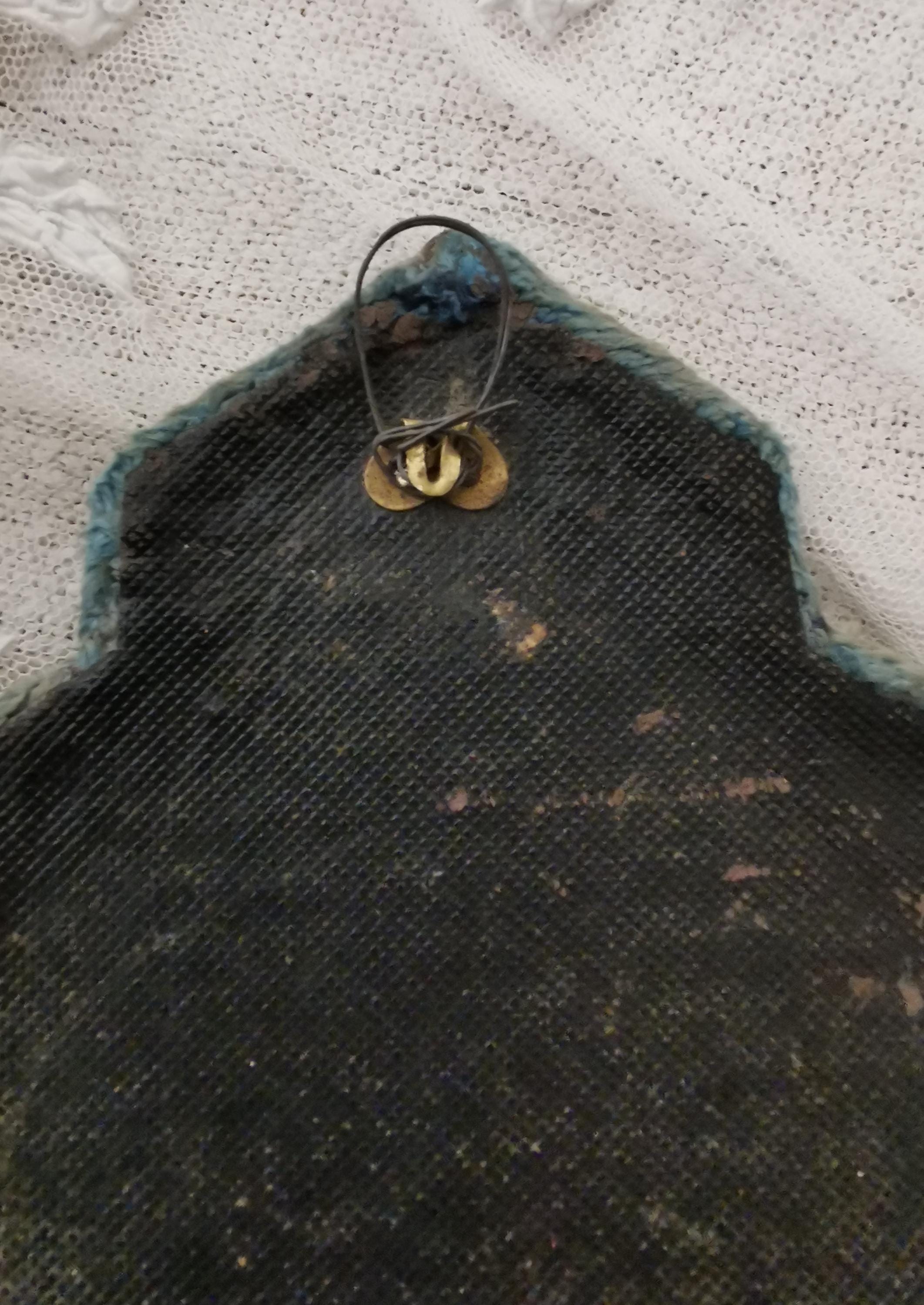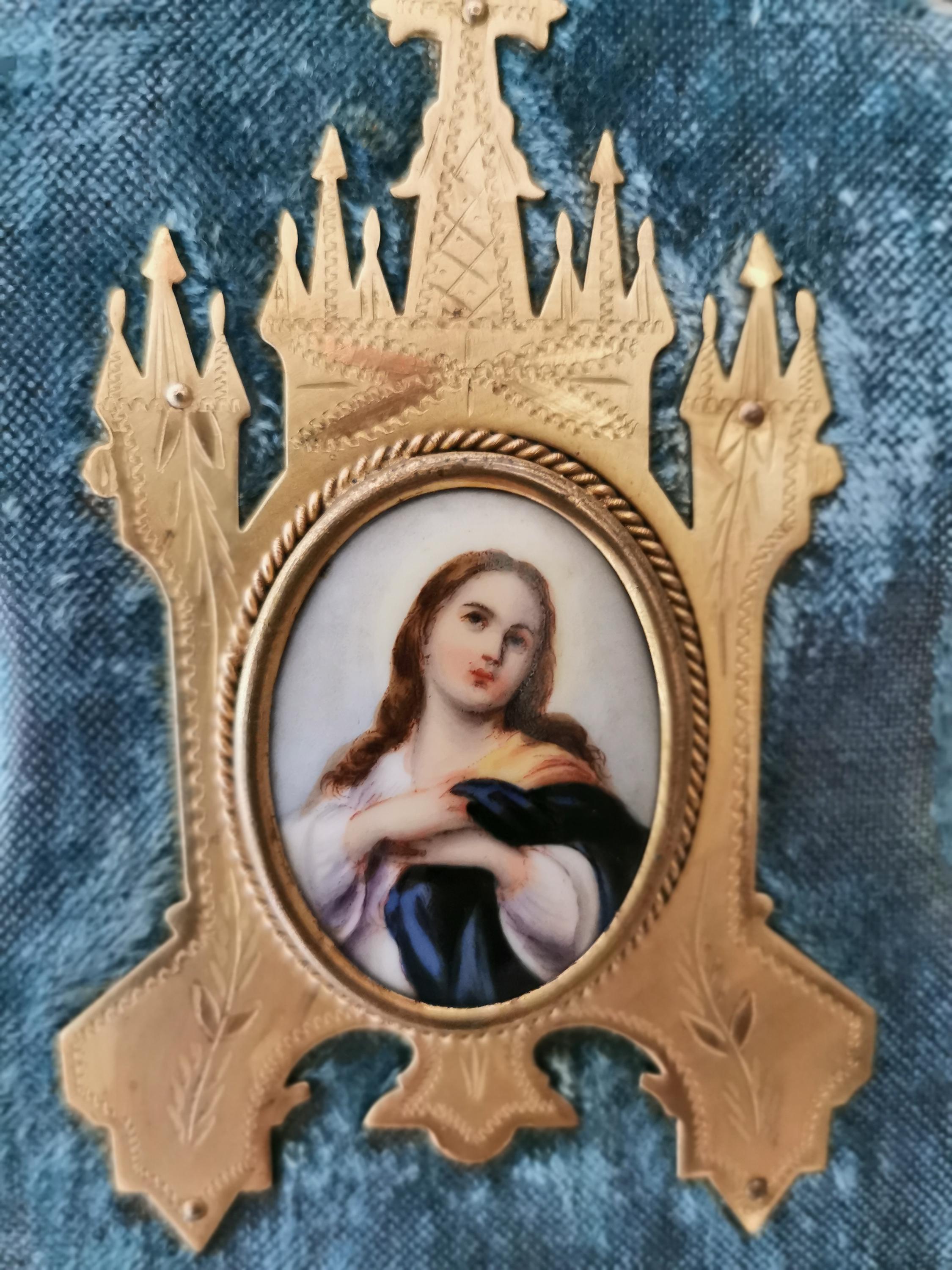 c 1890, Beloved object of devotion a very beautiful depiction of the Virgin Mary, set in a gilt frame mounted on a shaped, silk velvet covered backboard in a heavenly teal blue.