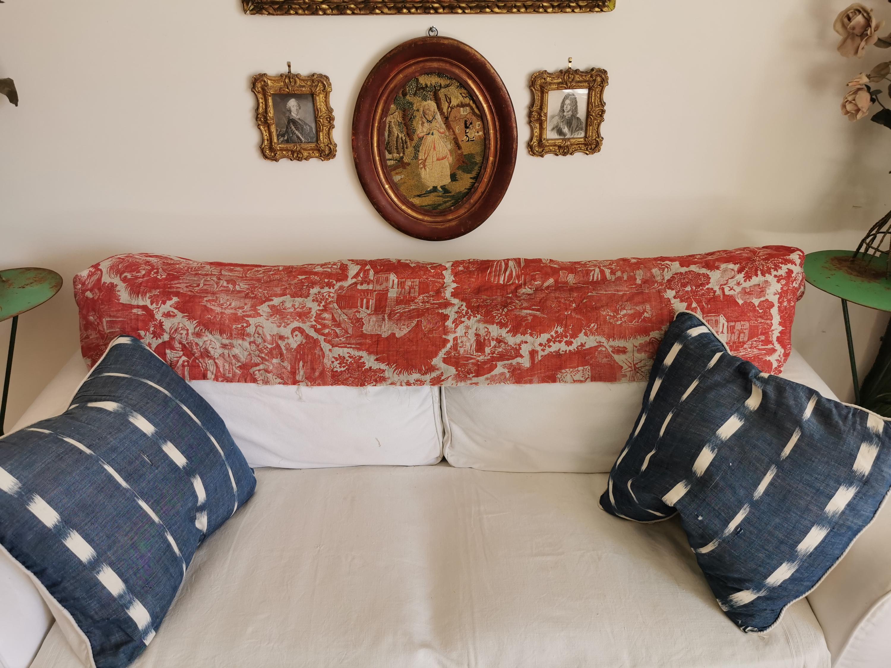Toile de Beautiran panel c 1800, the panel from a bed set has been cut along the bottom ( not by me) it's lined in chanvre, and quilted with very thin batting. Now suitable to face a very long bolster, or pillows. Ive used similar gorgeous pieces across the back of my sofas, giving decorative value without subjecting to wear. The piece is shaped as per the video. Very good antique condition.