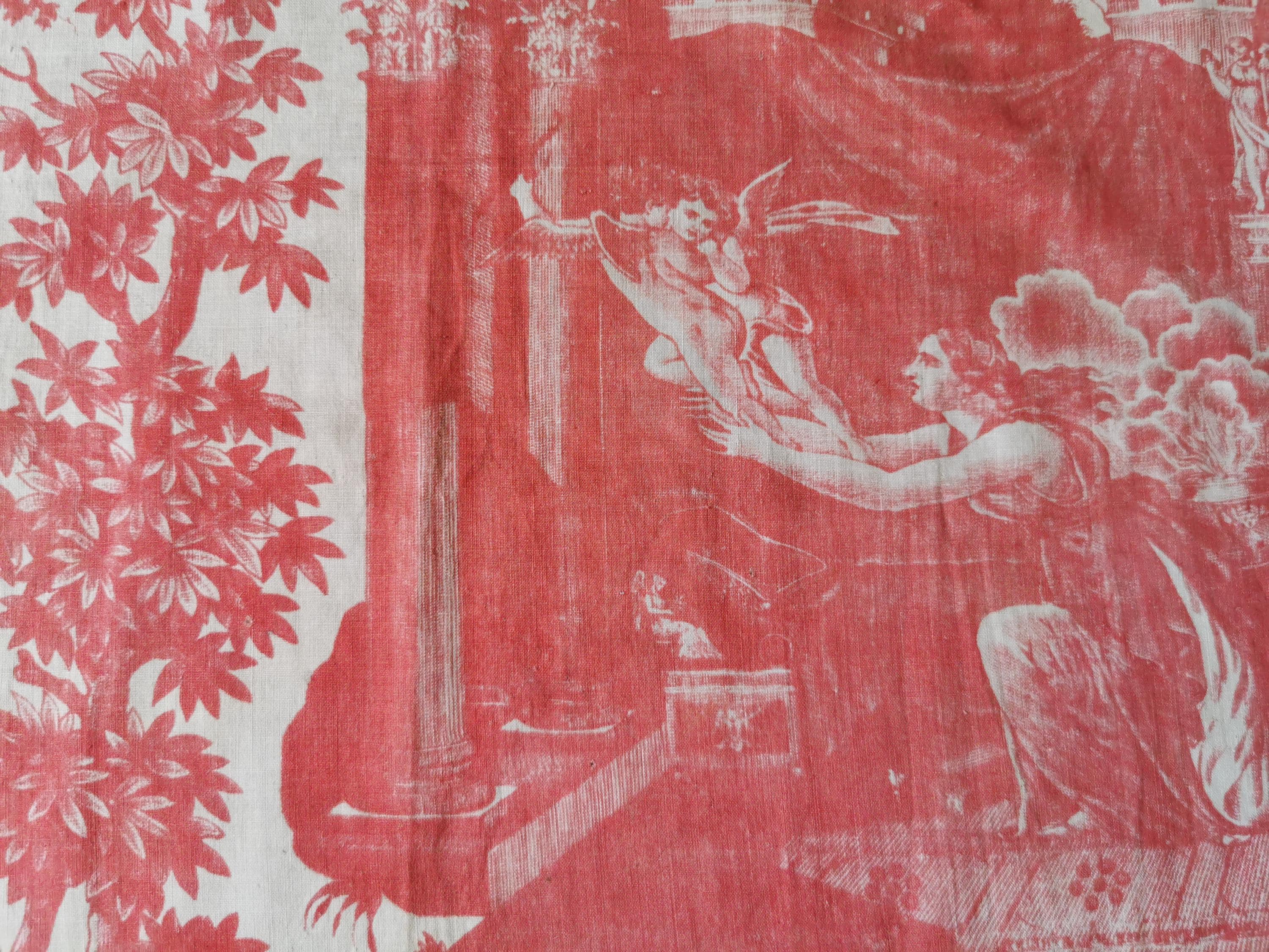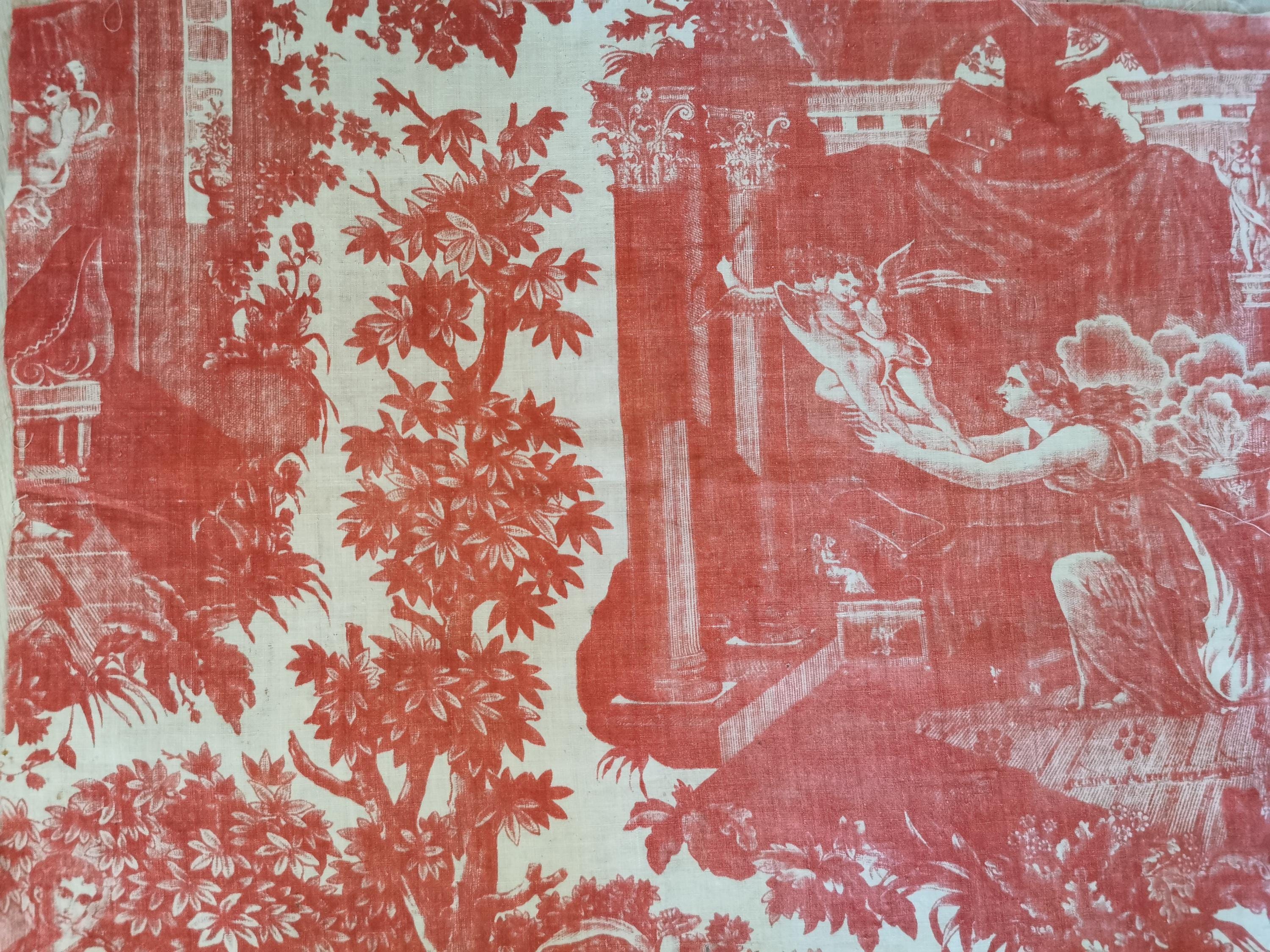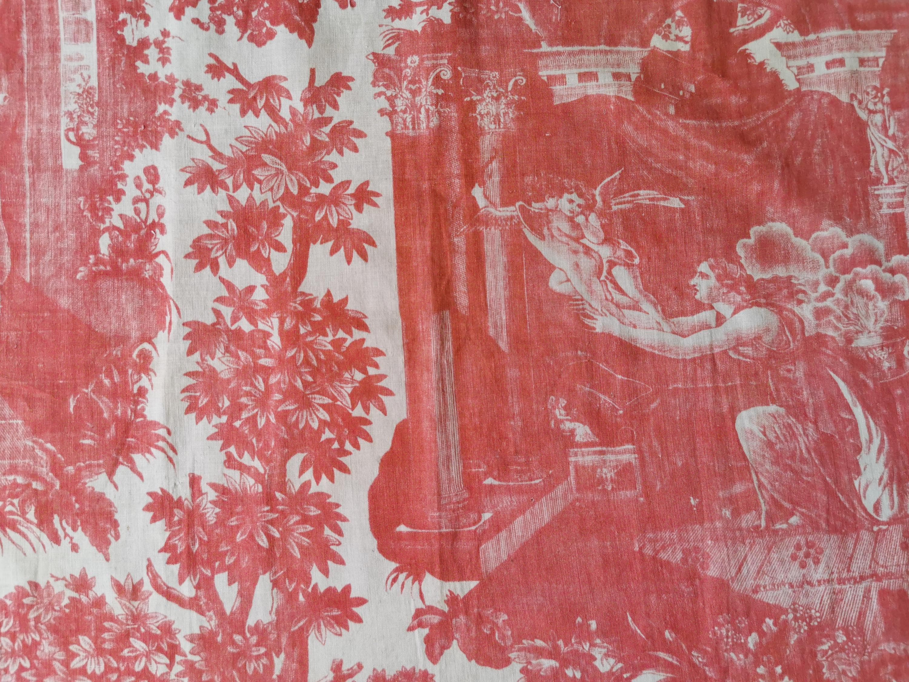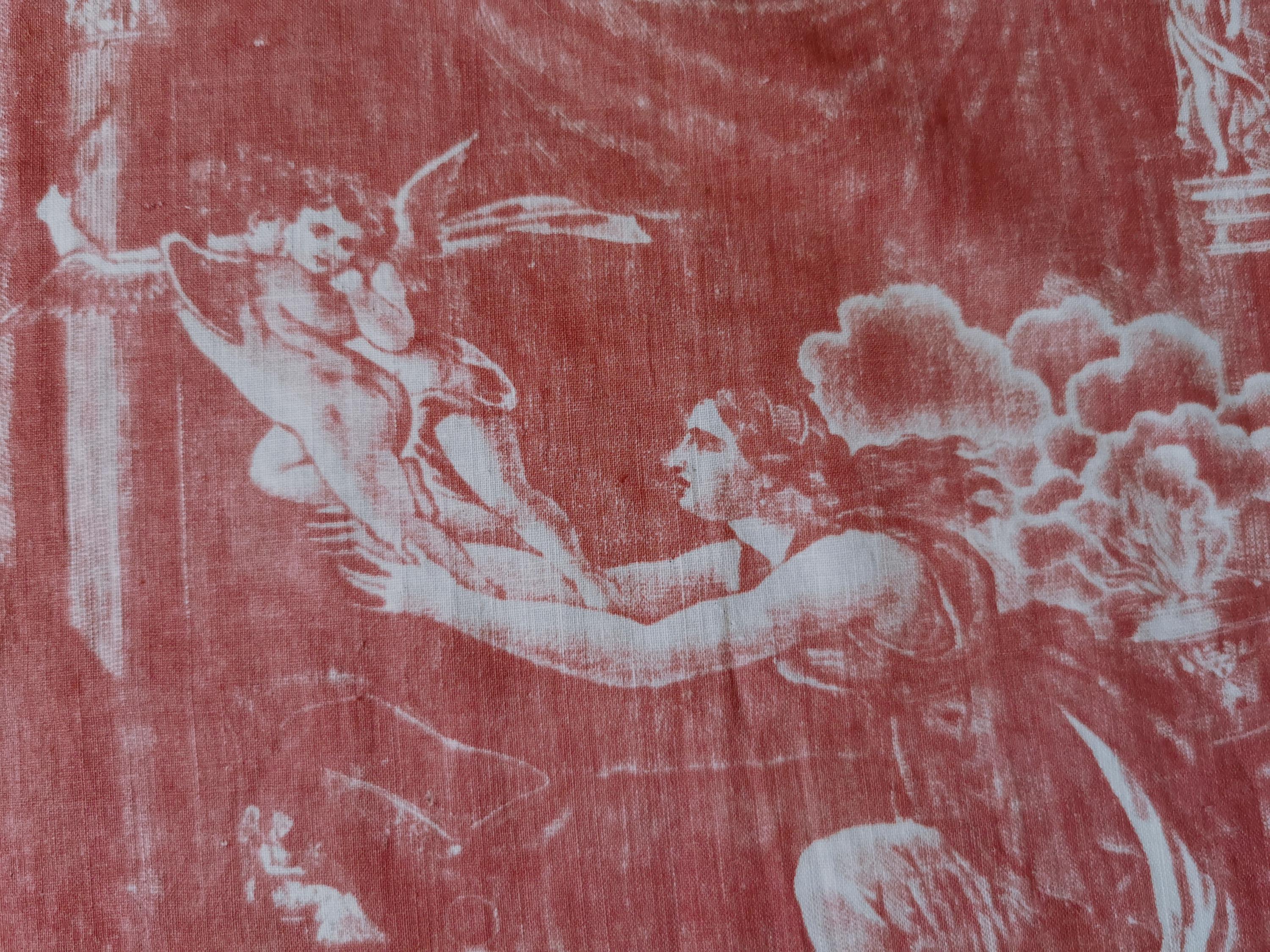 C 1800 panel of copper printed, Toile Psyche and Amour, (she's trying to hold on to love as it flies away), printed in rose madder on very thin cotton. The first 2 photographs useable side, last photograph is the back which is very faded. Only suitable for framing, Some small pinholes from previous quilting.