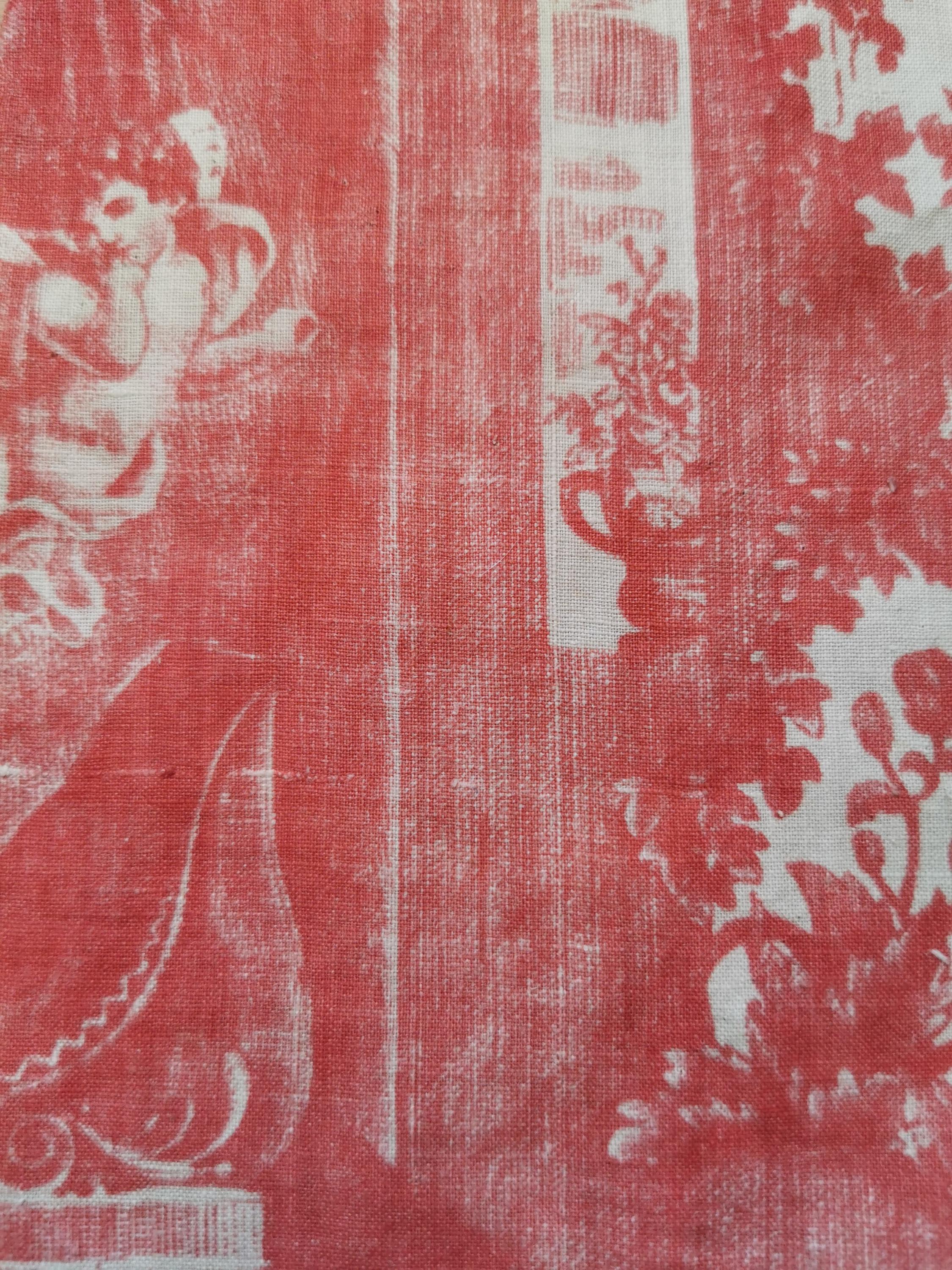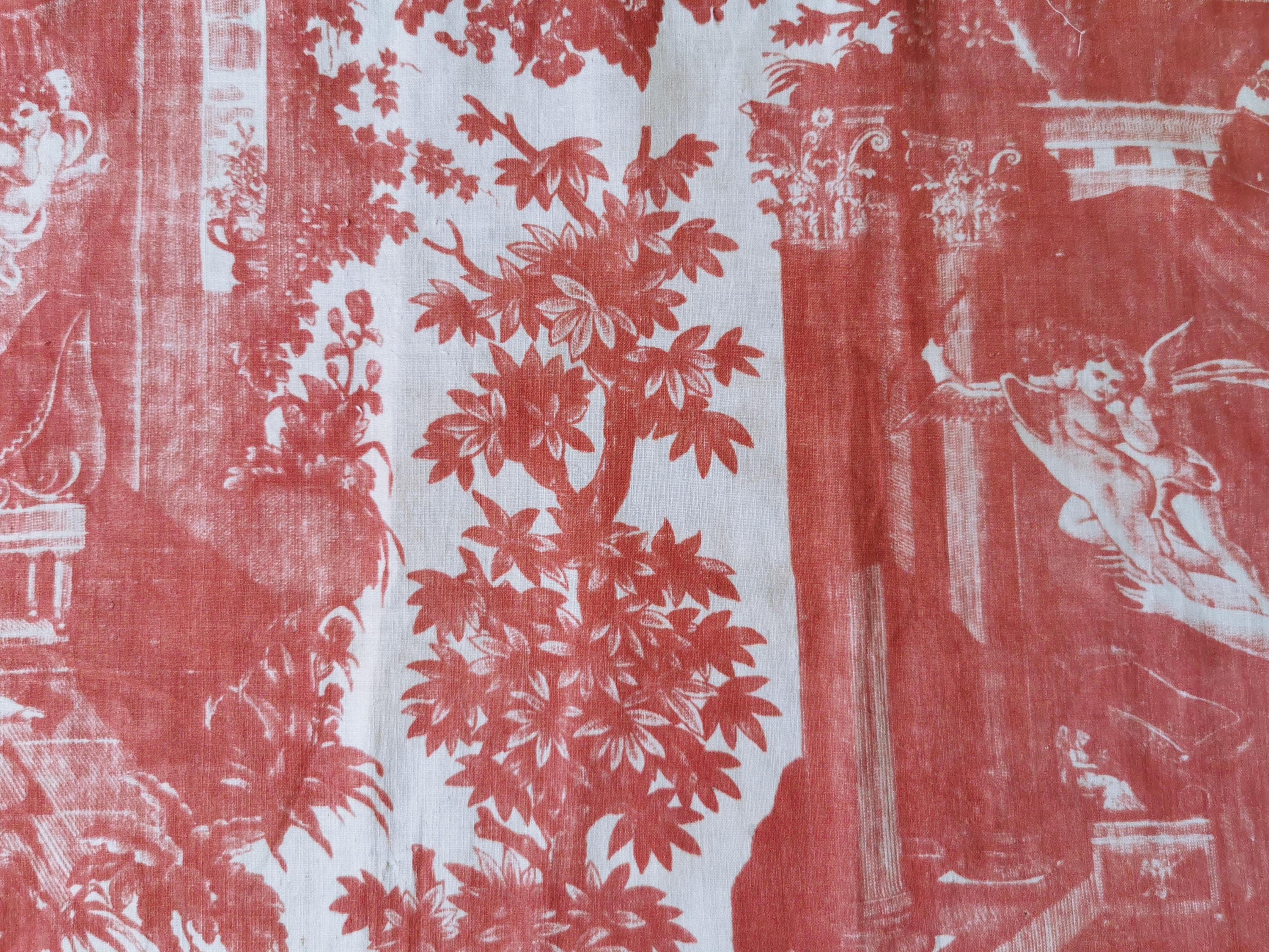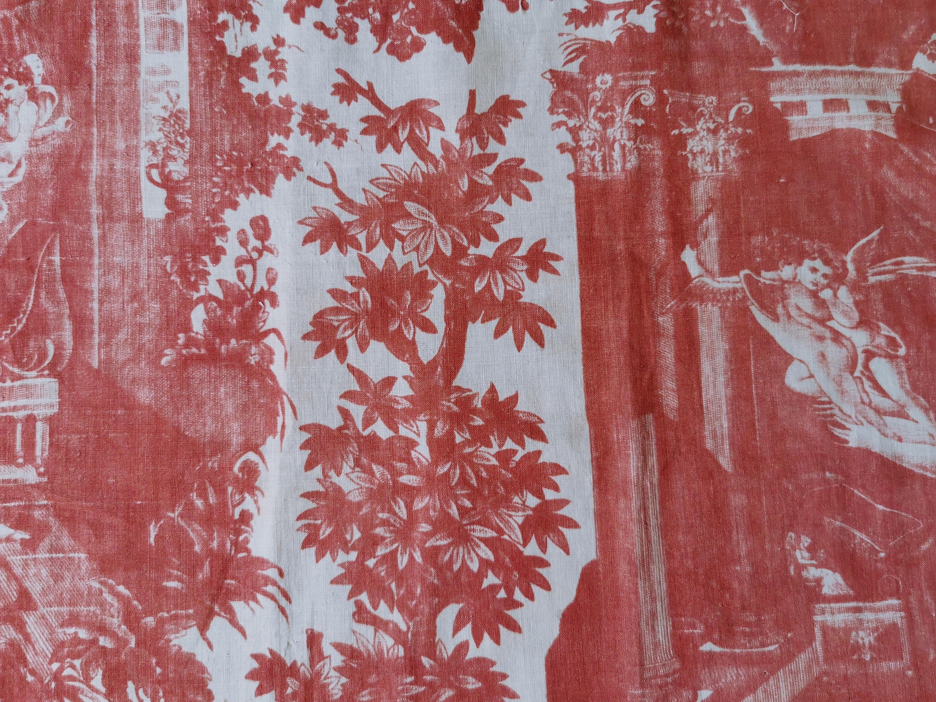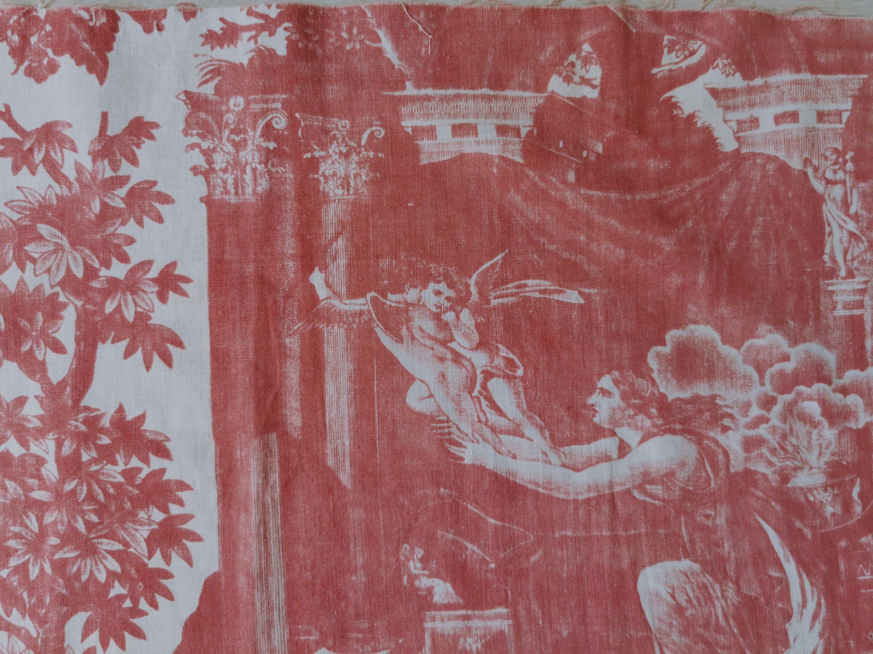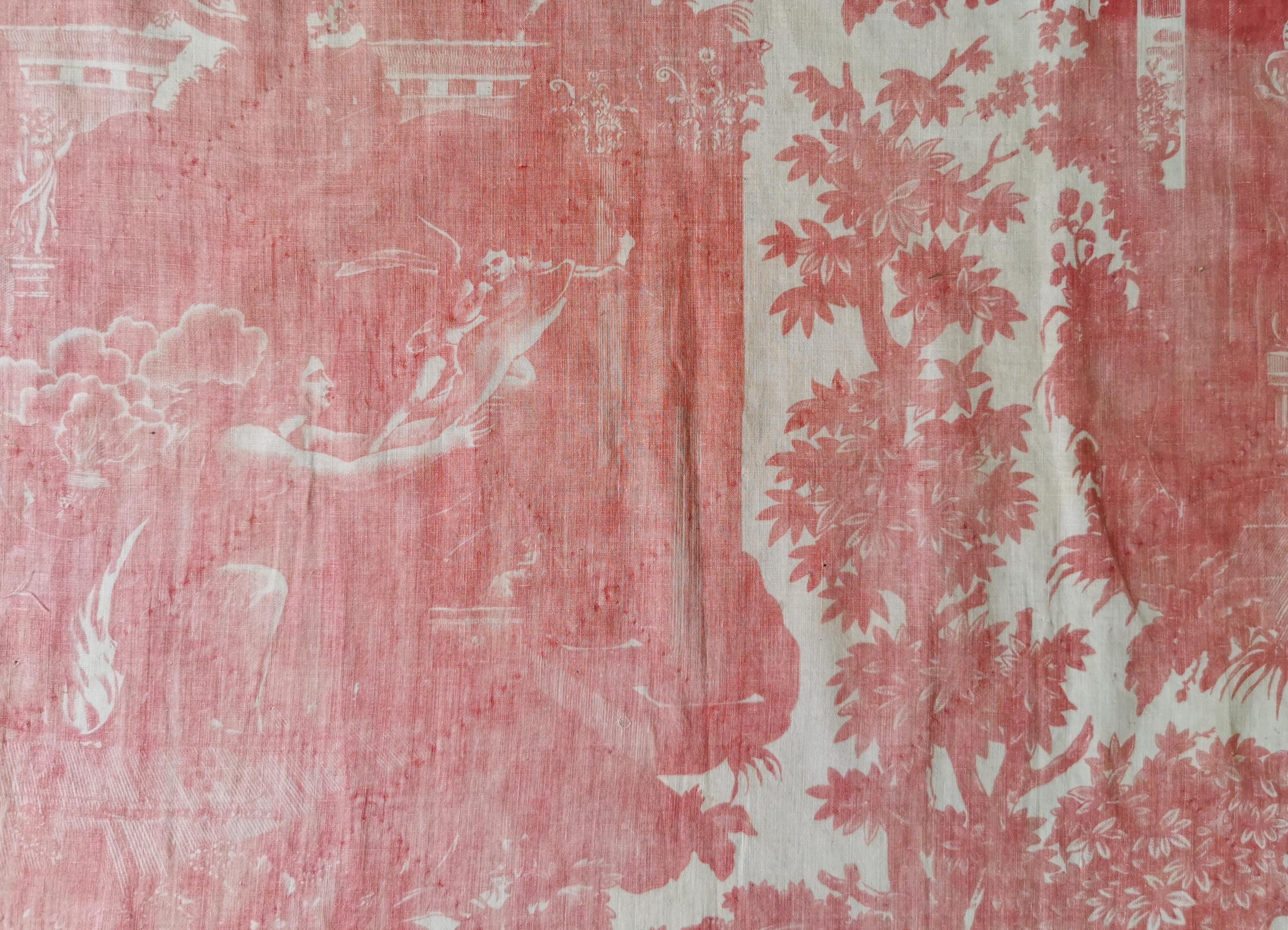 C 1800 panel of copper printed, Toile Psyche and Amour, (she's trying to hold on to love as it flies away), printed in rose madder on very thin cotton. The first 2 photographs useable side, last photograph is the back which is very faded. Only suitable for framing, Some small pinholes from previous quilting.